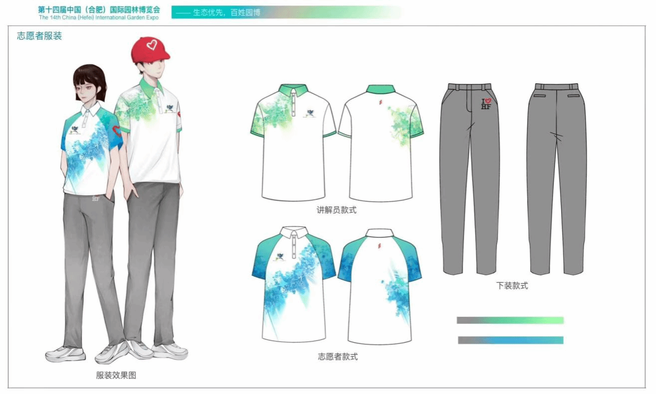 志愿者服装上图案是根据合肥市树广玉兰、安徽省鸟灰喜鹊、古徽州木雕、庐州剪纸等元素演变而来,突显合肥“生态、科技、人文”特色,展现志愿者活力自信的精神面貌。讲解员和志愿者服装通过颜色与图案分布进行区分:讲解员服装图案以青春绿为主,颜色清新靓丽,强调生态园博,绿色发展理念,展现出穿着者朝气蓬勃的精神风貌。志愿者服装以科技蓝配色为主,色彩青春活力,视觉效果上更具动感,增强科技亮色,突出科技园博理念。