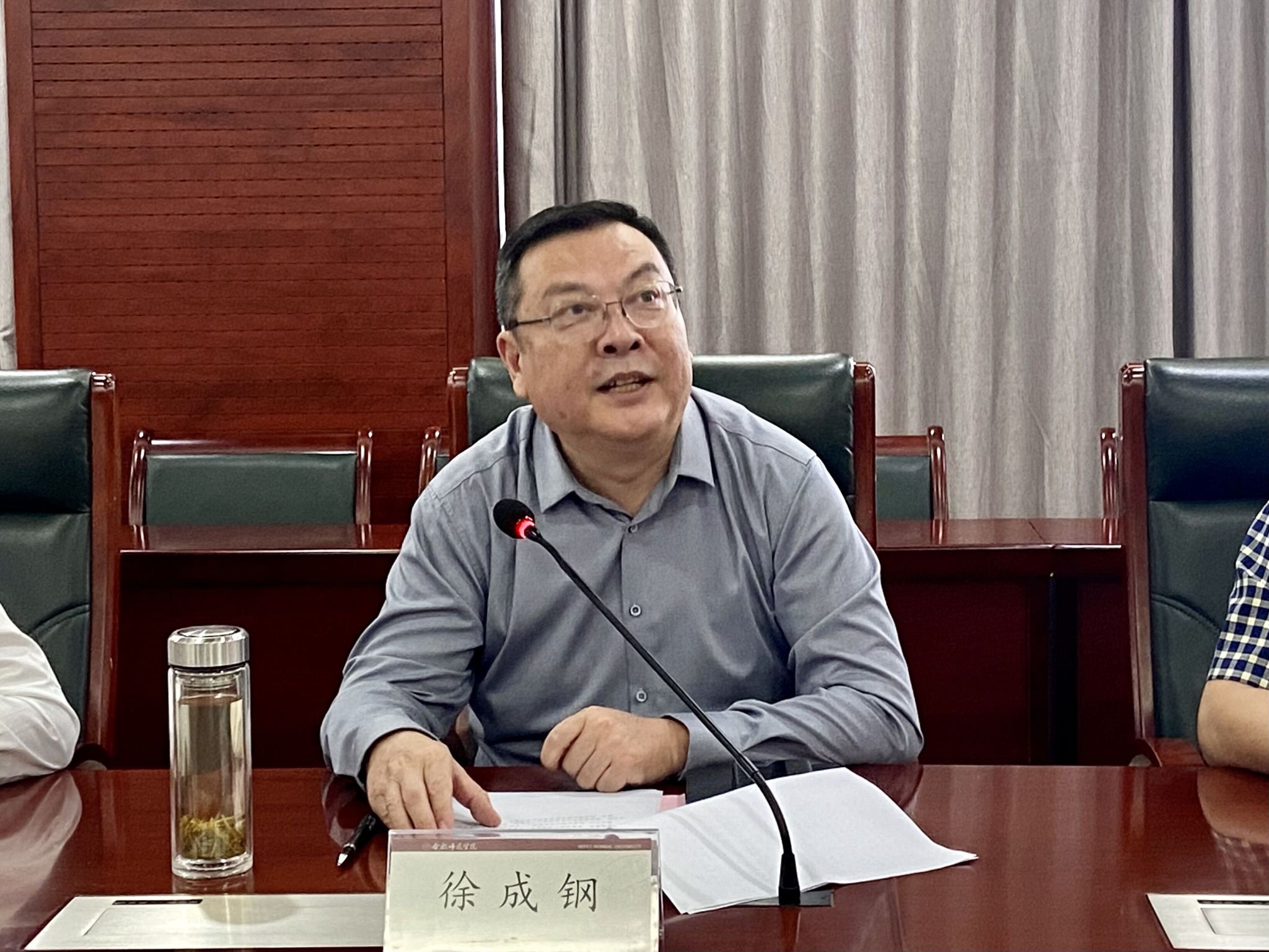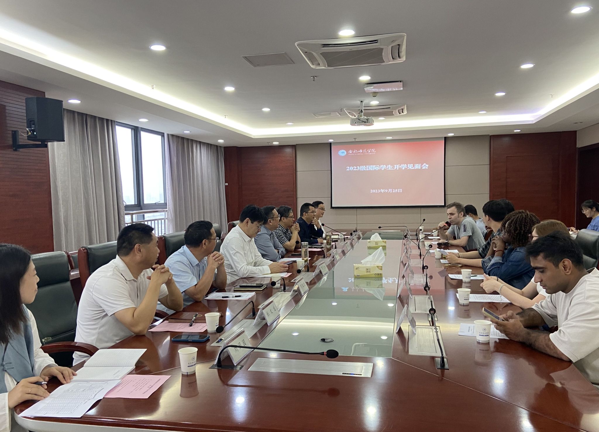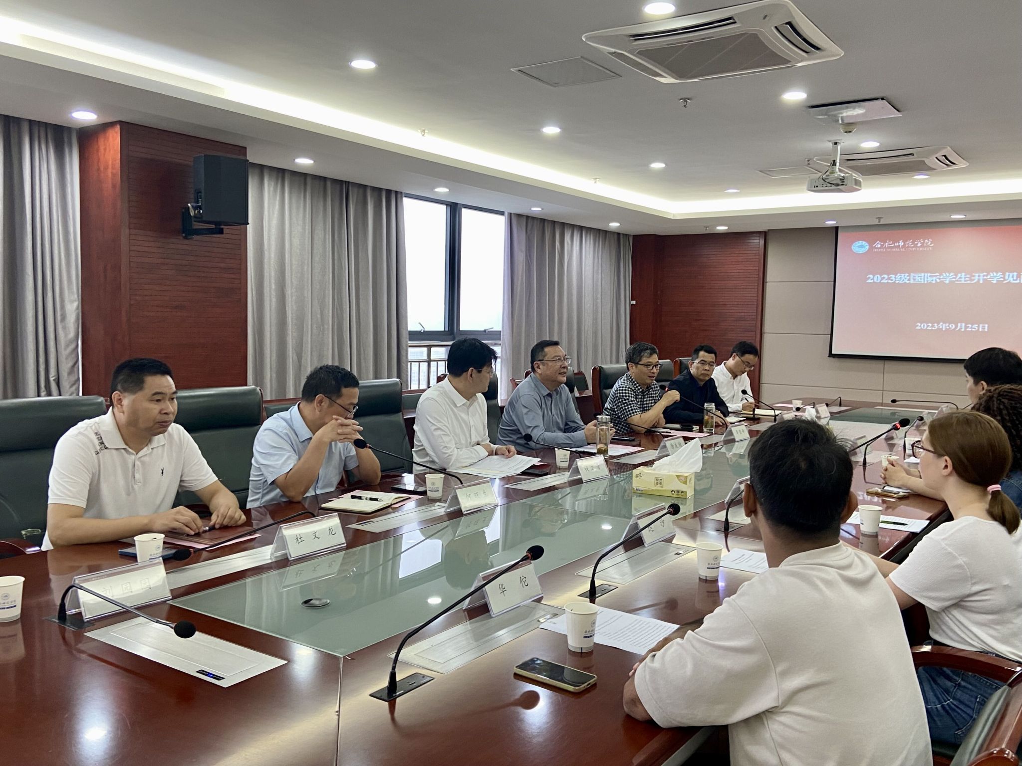 本网讯 9月25日,学院在锦绣校区第二会议室召开了2023级国际学生开学见面会,院党委书记徐成钢出席了见面会并讲话,教务处、团委、国际教育学院、后勤处、保卫处、文学院等主要负责人及2023级国际学生共同参加了此次见面会,学院党委委员、副院长华银峰主持会议。
