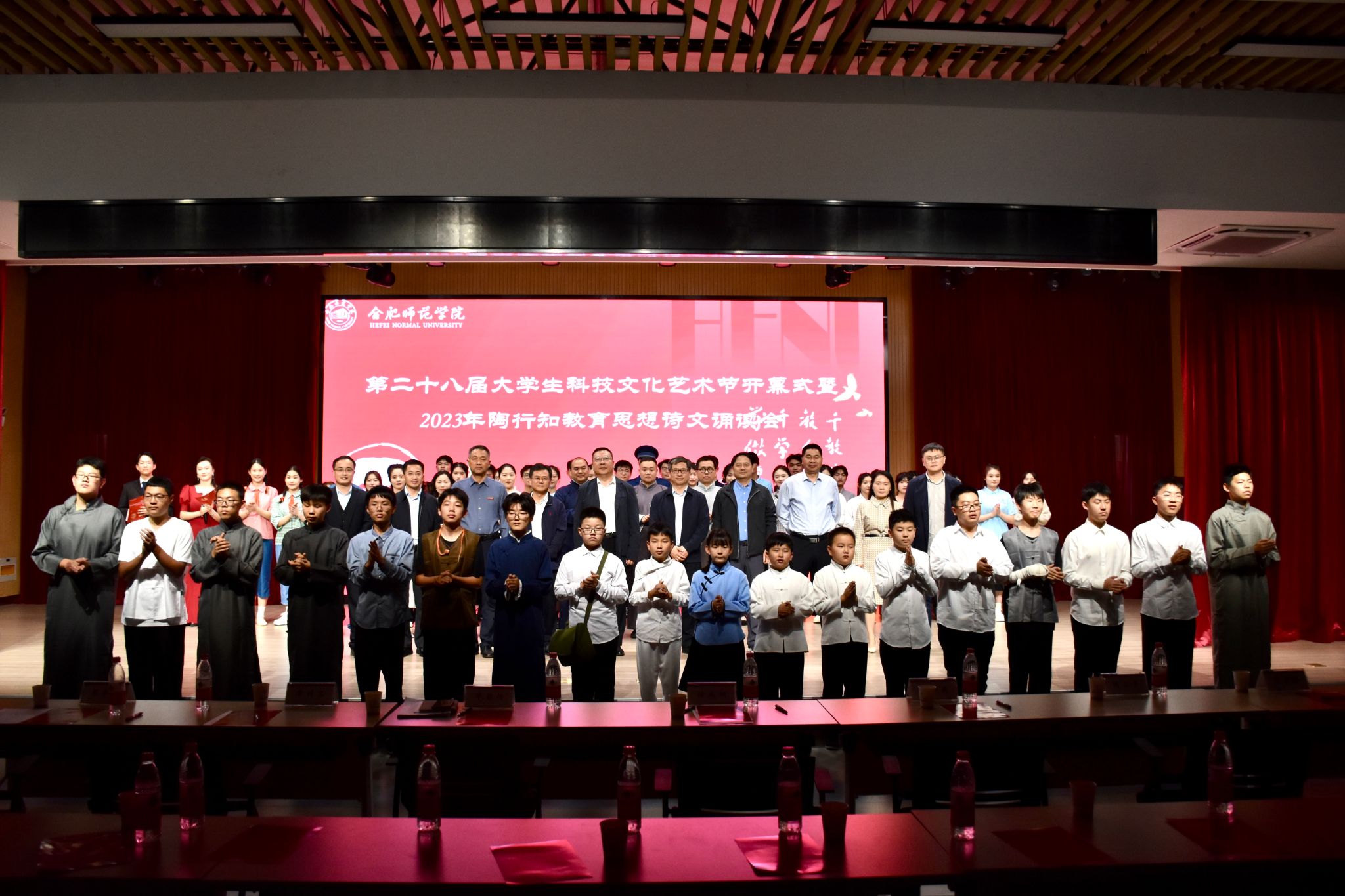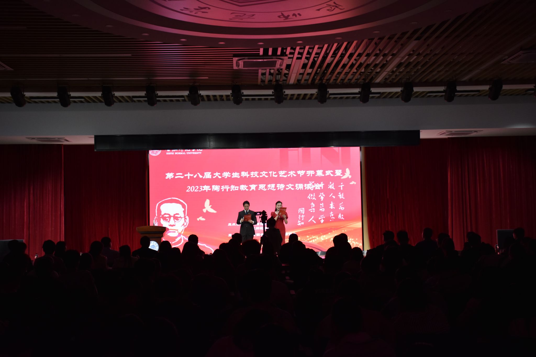 10月25日下午,学院于锦绣校区大学生活动中心举办第二十八届大学生科技文化艺术节开幕式暨2023年陶行知教育思想诗文诵读会。安徽省陶行知研究会会长、院党委书记徐成钢,党委委员、副院长华银峰,党委委员、组织部部长赵帮恚,党委委员、宣传部部长常树宝及学院相关部门、附属西安路学校负责人,师生代表200余人到场观看。