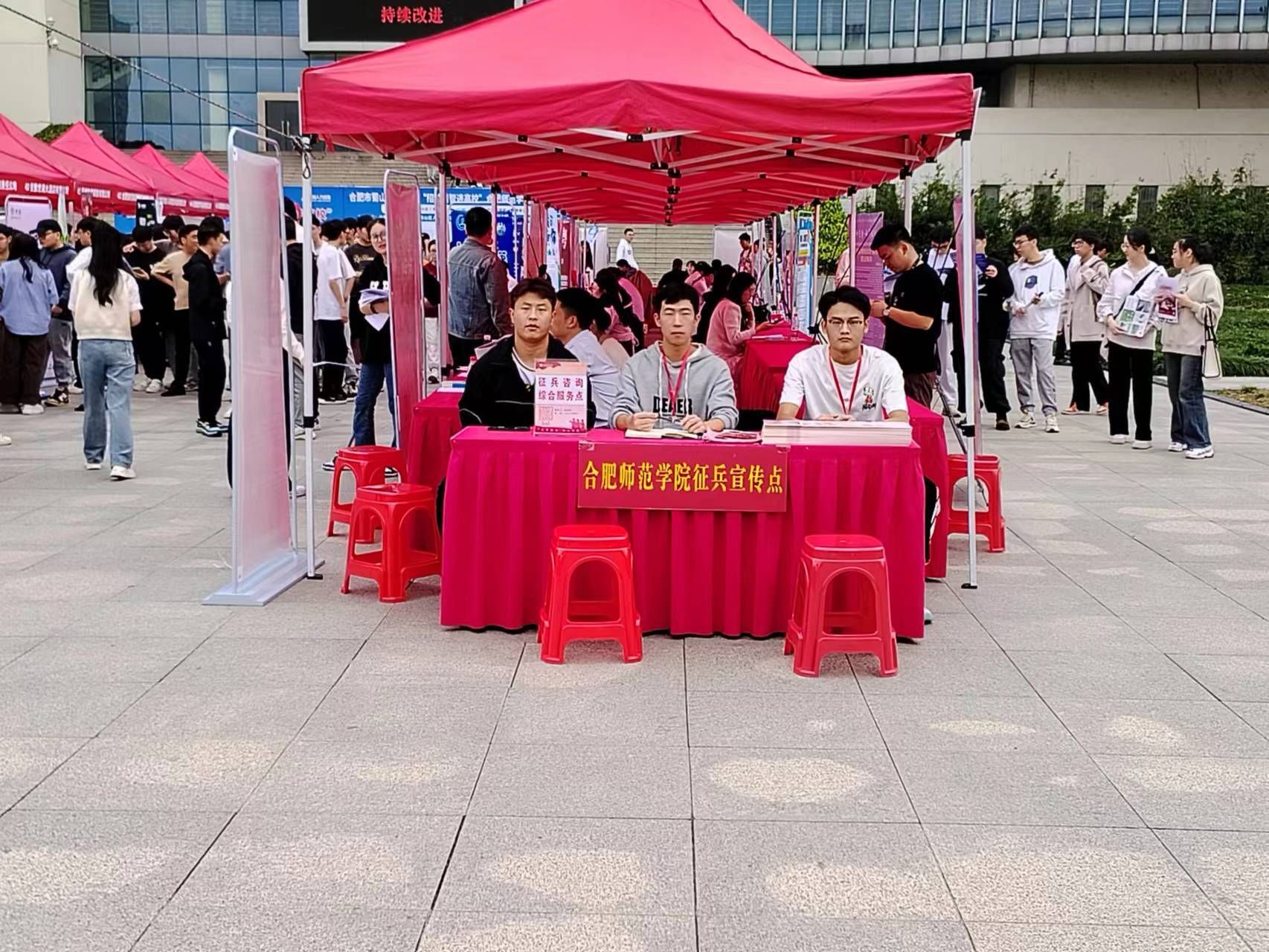 学生工作(部)处、人武部在招聘会现场,就大学生征兵、入伍等,接受毕业生们的咨询,解读相关政策。