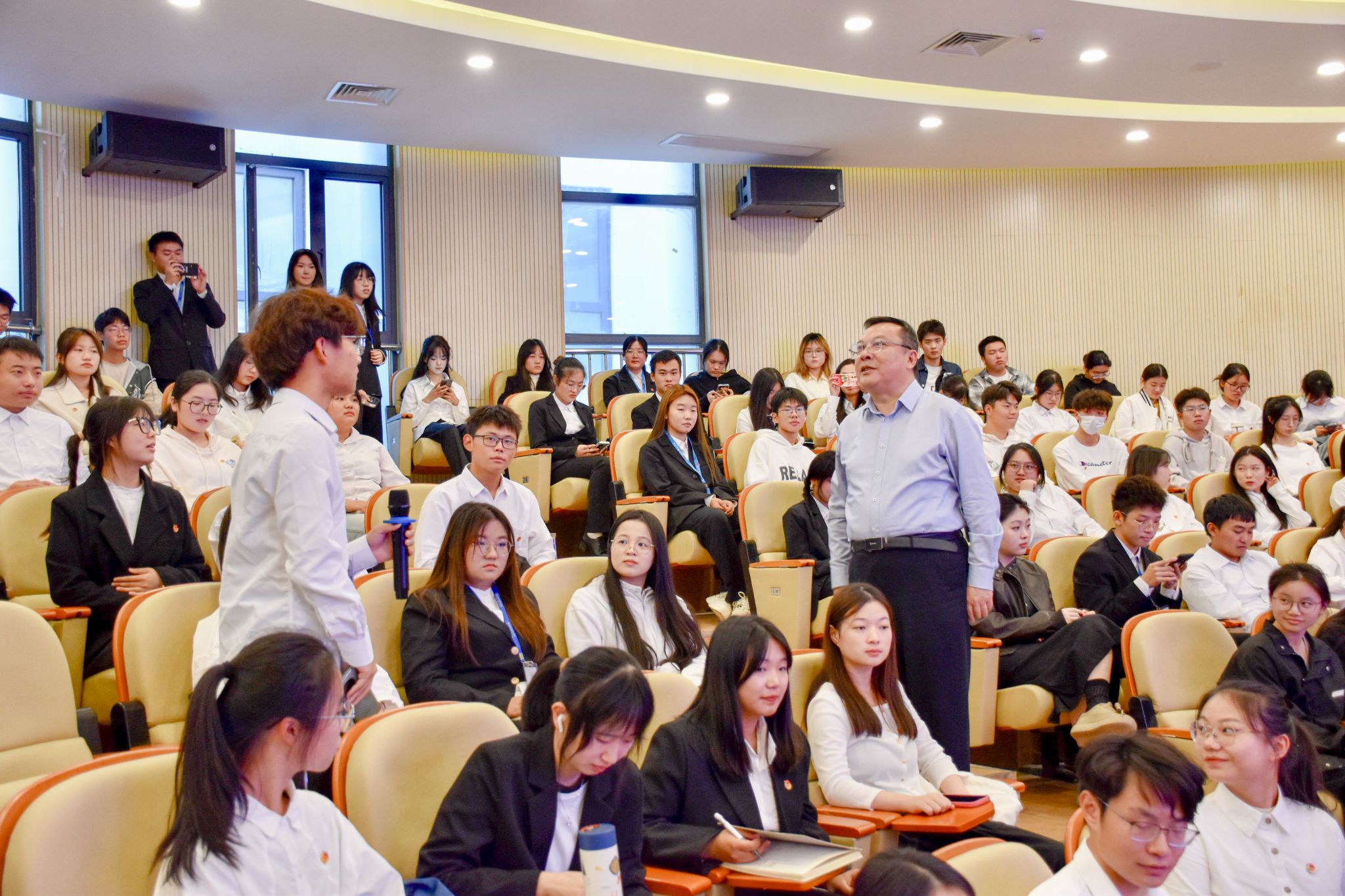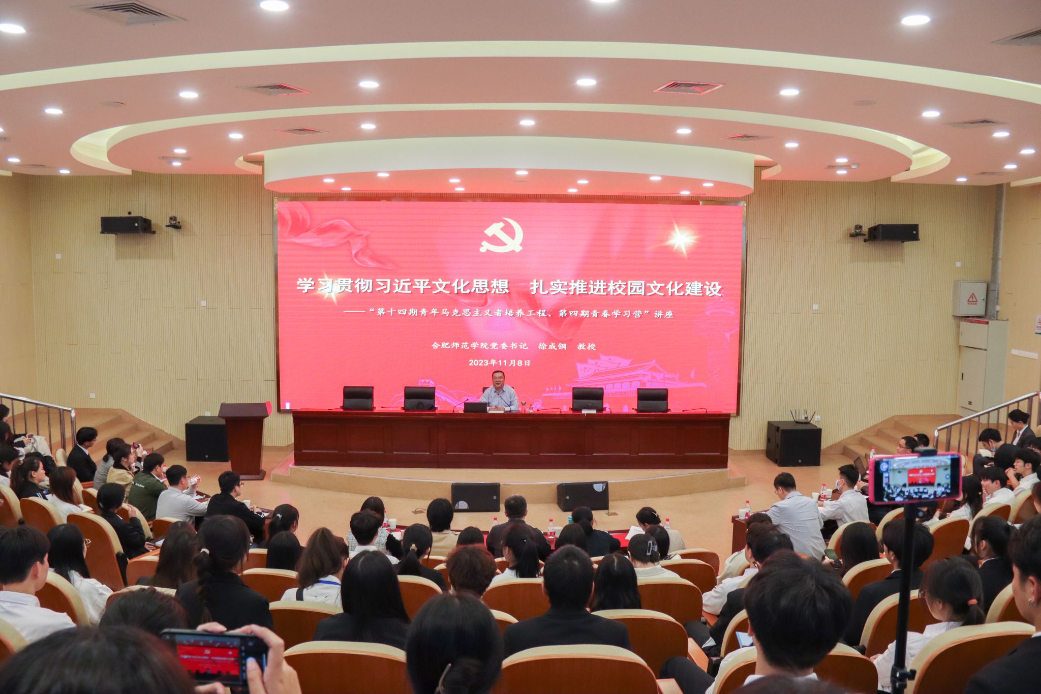 11月8日下午,院党委书记、中国陶行知研究会副会长、安徽陶行知研究会会长徐成钢教授为十四期青年马克思主义者培养工程、第四期青春学习营作题为“学习贯彻习近平文化思想、扎实推进校园文化建设”的首场专题报告。相关二级学院党团负责人、辅导员,学生工作部、团委全体人员,青马工程和青春学习营全体学员300余人聆听报告。