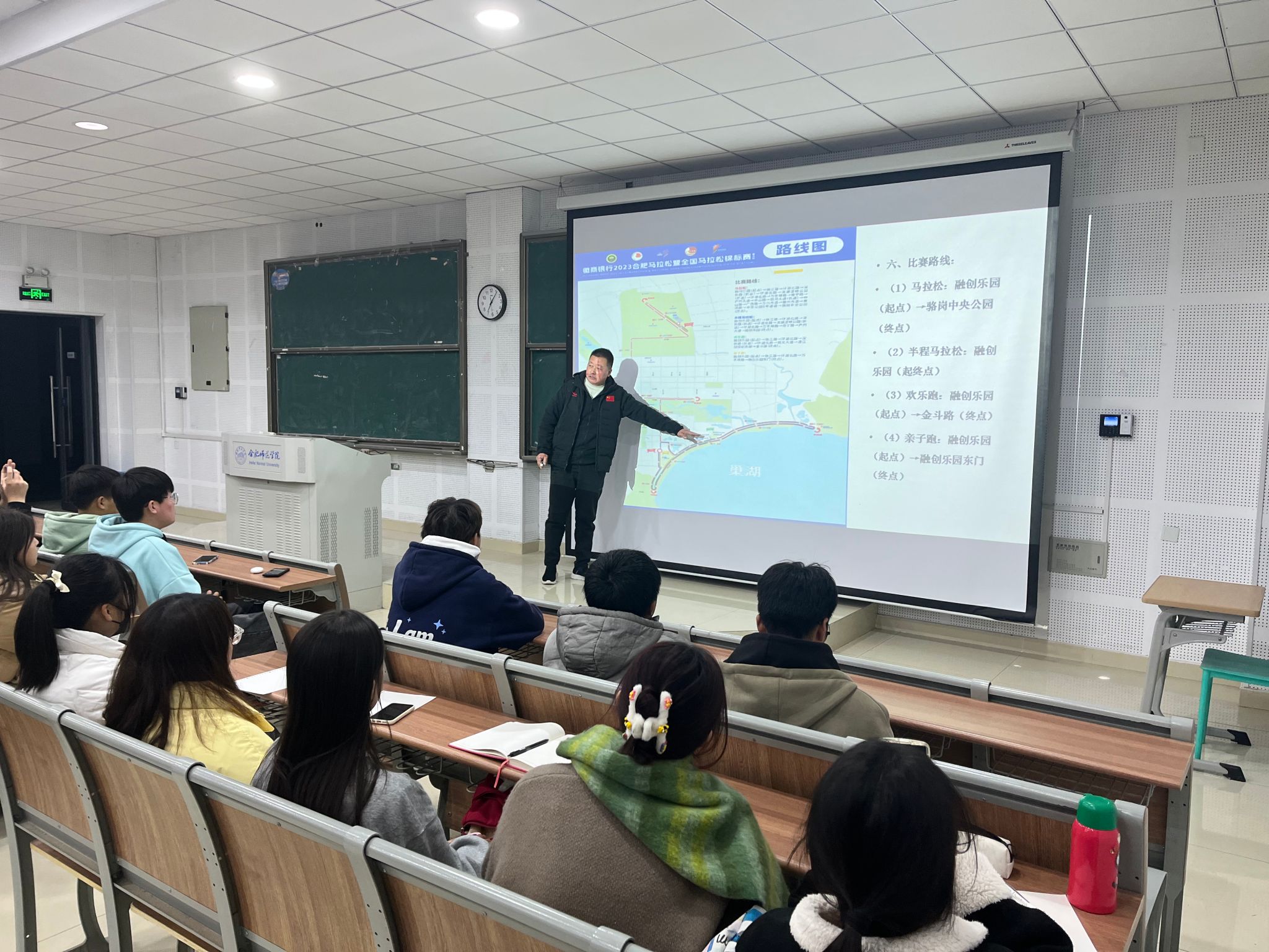 志愿者赛前培训会于锦绣校区和滨湖校区同步举行,为了更好地发挥阵地作用,合肥马拉松赛组委会工作人员对志愿服务精神、马拉松知识、赛事信息简介、志愿者分组工作安排及岗位职责等内容进行详细讲解,确保志愿者在赛事过程中能够高质量地完成志愿服务工作。院团委召开志愿者出征动员大会对前期准备工作作出最后总结,介绍了马拉松赛事的有关情况,并重点强调了分组情况和赛道安排。为保障比赛当天志愿服务工作有序开展,全体志愿者参加了赛前联调演练。一切对照比赛当日进程进行演练,全面熟悉赛场与岗位,力争为合马比赛提供一流服务。