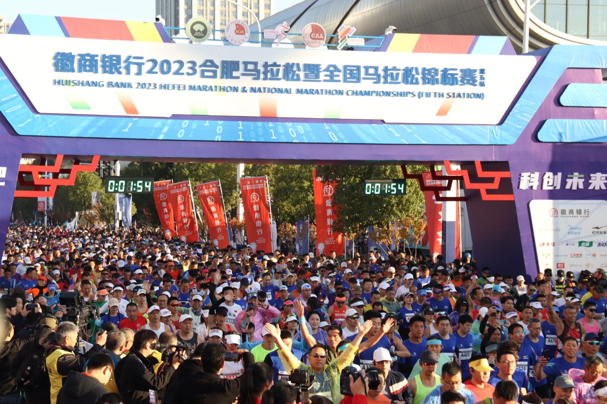 据悉,本次马拉松赛全程跑、半程跑报名选手总和突破5万人,总和中签率约为44%。今年共有49.60%的选手来自合肥市以外,外籍选手37人。其中,本次开跑人数30000人,包括全程10000人、半程12000人、欢乐跑4000人、亲子跑4000人。杭州亚运会冠军、国内马拉松纪录保持者何杰,近三届男子全运会冠军尹顺金、董国建、仁青东知布等59名国内顶尖马拉松精英选手也到达比赛现场,与大众跑友同场竞技、共展风采。