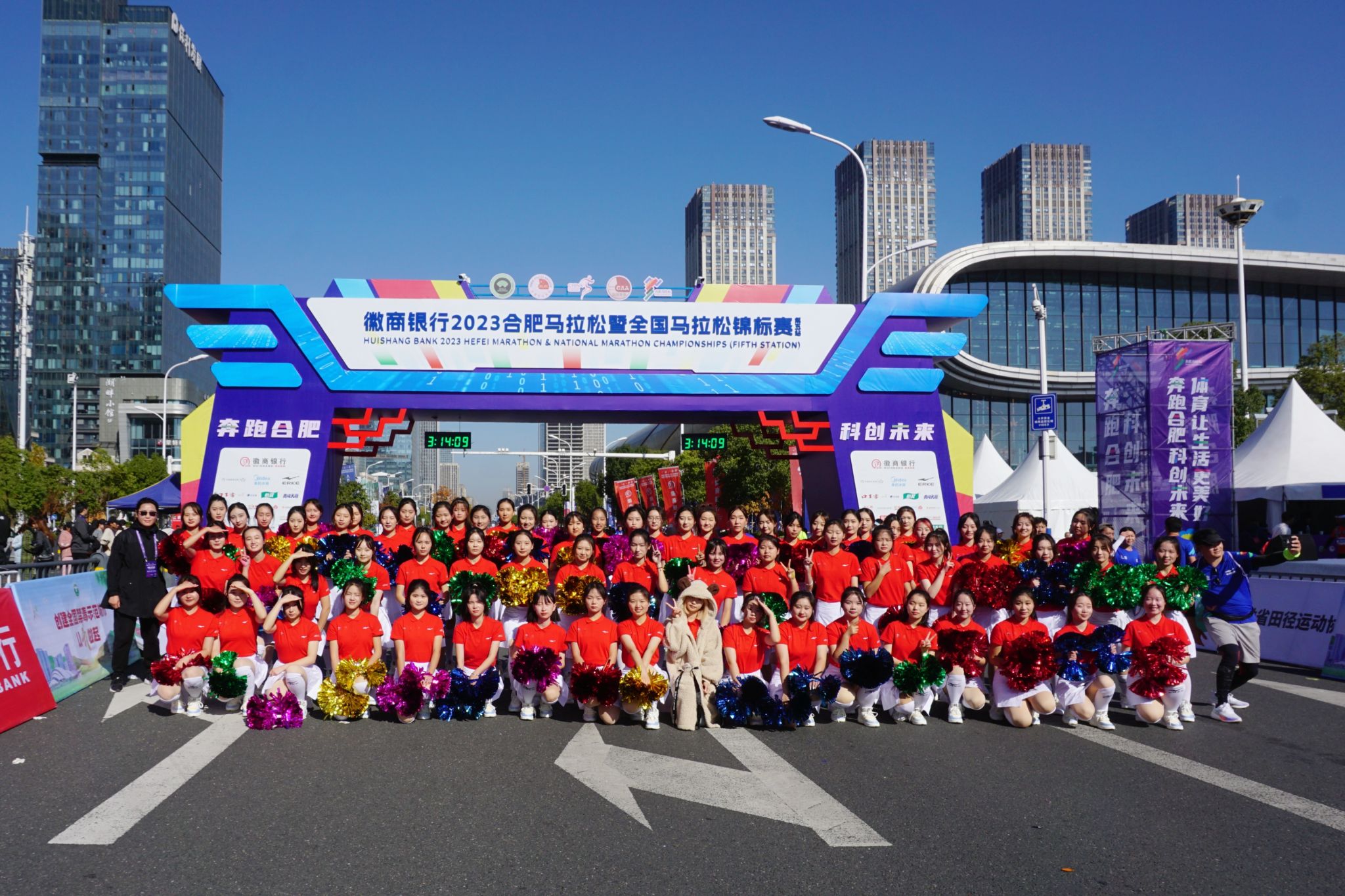 晨曦初露,发令枪声与阳光一同穿过地平线,万众期待已久的2023合肥马拉松赛正式拉开序幕!上午7点30分,30000余名选手如利箭划破寂静长空,坚毅地踏上了专属于他们的赛道。这一刻,欢呼声与加油声响彻云霄,激情瞬间被点燃,周围的观众不断高呼,热情高涨。赛道上各类肤色各种服装的选手激情奔跑,像彩旗在劲舞飘扬。赛道旁比肩接踵,鼓乐齐鸣。笑容洋溢、手摇红旗的青年学生互相招呼着拍照,佩戴工作牌、严阵以待的志愿者全神贯注地观看比赛,手持花球、不断跃动的啦啦操志愿者用活力为比赛添上艳丽色彩。今天,合肥向世界展现着他的热情!