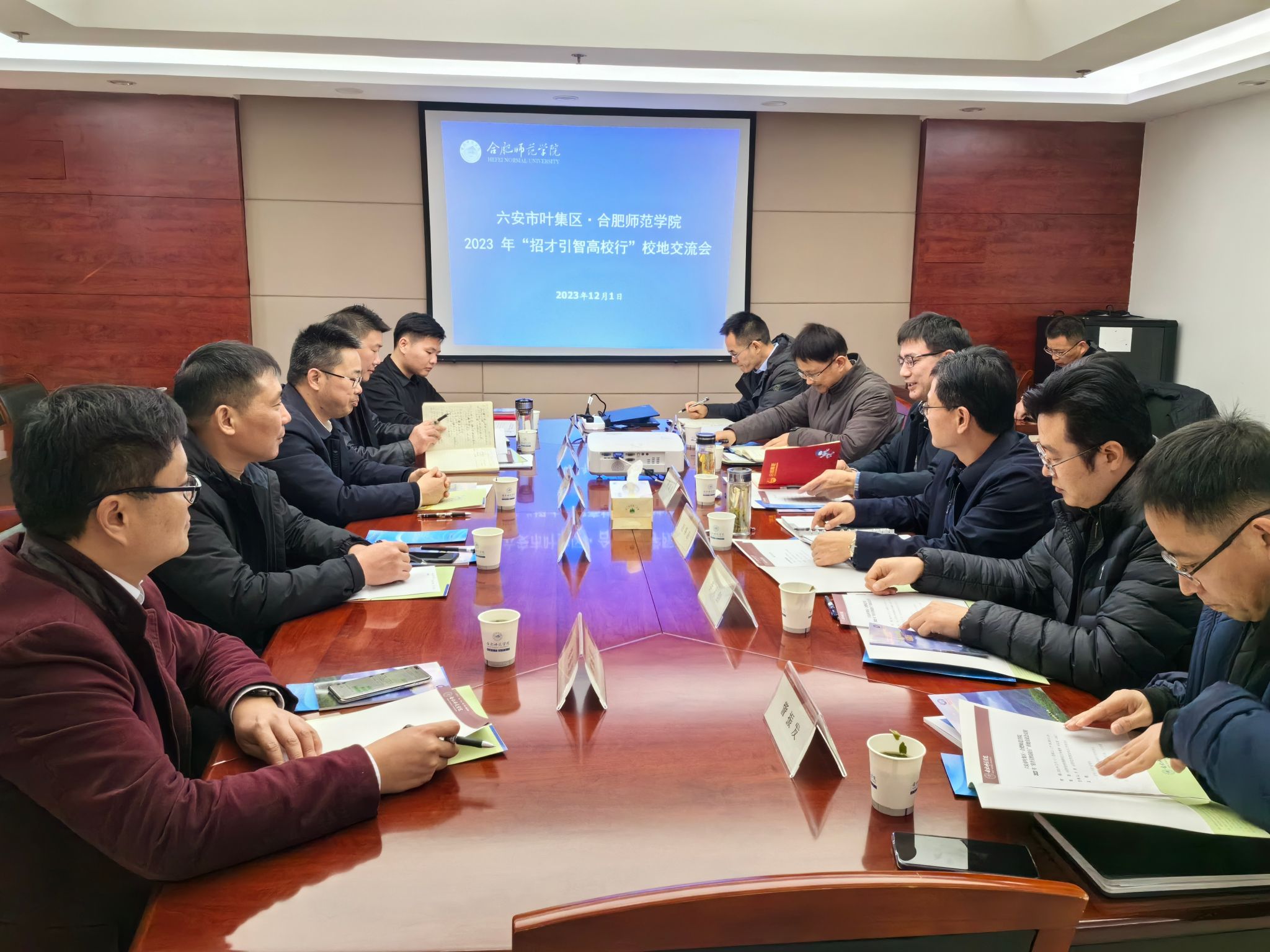 会议伊始,周端明代表学院对叶集区委组织部一行的到来表示热烈欢迎,并介绍了学院发展历程、办学特色、人才培养、专业设置及毕业生就业需求等方面的基本情况。同时表示希望与叶集区多方面开展合作,深化校地交流合作,服务六安高质量发展。胡四军介绍了叶集区情区貌、产业园招商引资情况、人才政策等叶集区基本情况,重点介绍“人才兴皖”工程中针对高校毕业生的“青年俊才”政策,邀请学校实地走访、走进企业,期待与合师开展产学研,实习、实践,创新创业等多方面合作。