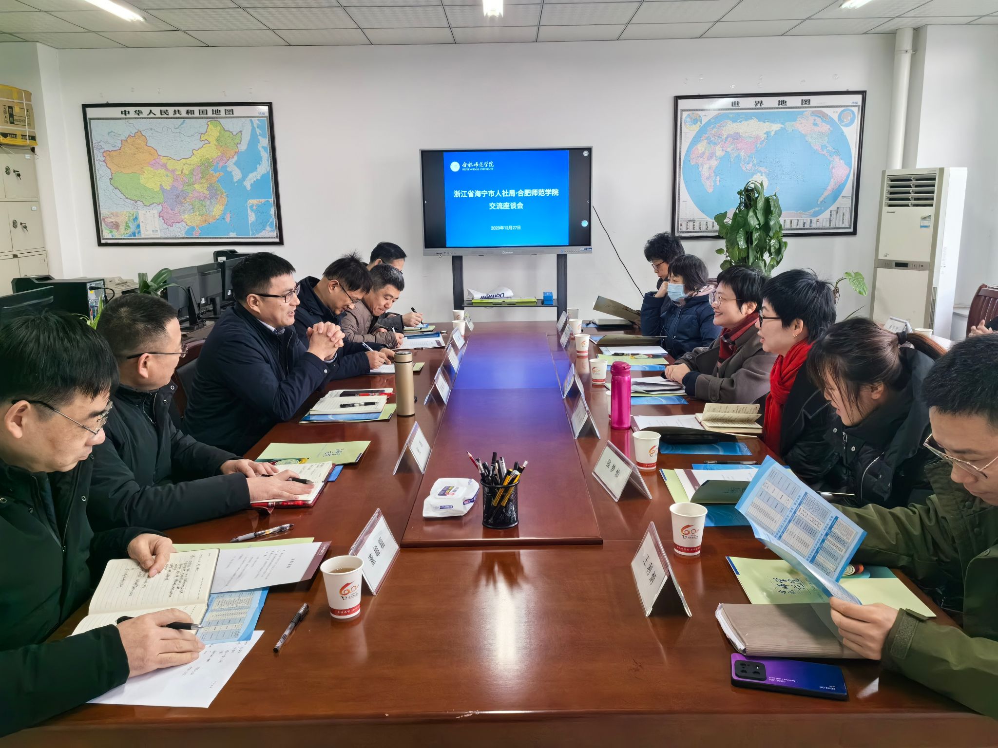 12月27日,浙江省海宁市人力资源和社会保障局党组成员副局长沈燕明一行来我院交流座谈。院党委委员、副院长周端明,就业创业工作处处长李健、副处长张晖,电子信息与集成电路学院副院长范程华,物理与材料工程学院党委副书记吴震,化学与制药工程学院副院长董雄辎参加会议。会议由李健主持。