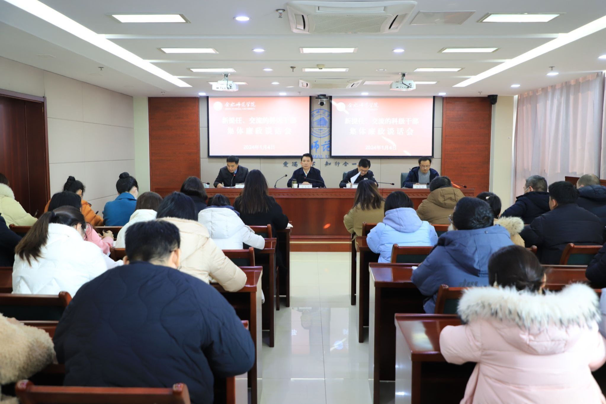 1月4日下午,学院纪委召开会议,对年前新提任、交流的科级干部开展集体廉政谈话。院党委委员、纪委书记、监察专员徐文林出席会议并讲话,院党委委员、组织部部长赵帮恚,纪委办综合管理室主任梁继维参加会议;会议由院纪委副书记、纪委办主任舒剑主持。