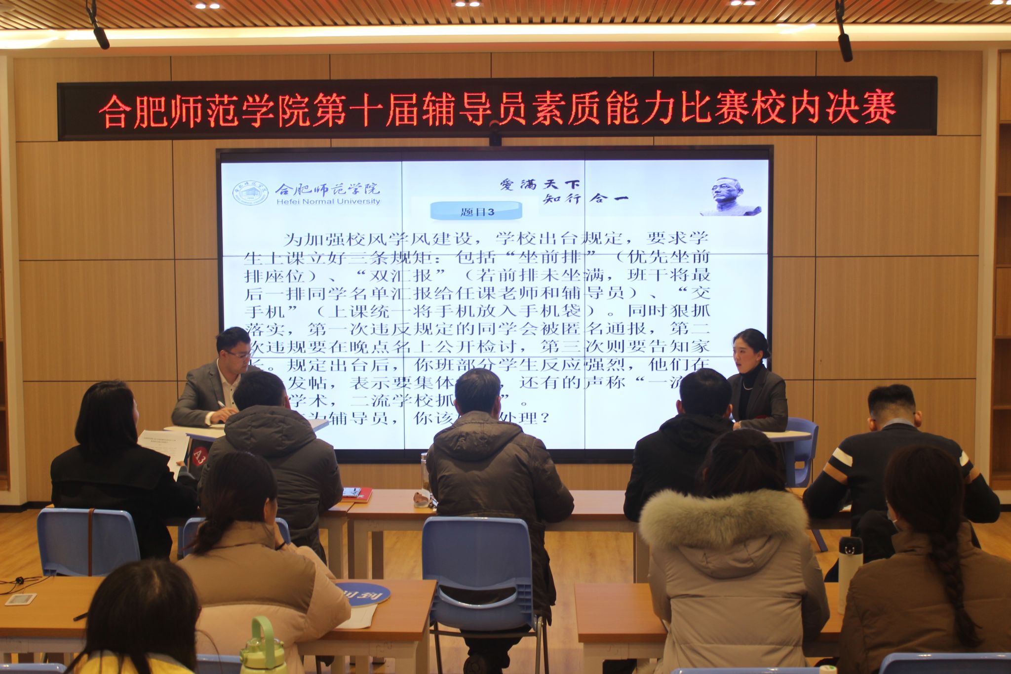本次校内选拔赛分为预赛和决赛两个环节,预赛为基础知识测试,全体辅导员参赛,最终10位选手展露锋芒进入决赛。1月8日下午,辅导员素质能力大赛校内决赛在逸夫楼举办。安徽师范大学马克思主义学院教授朱平、副教授陈勇,学生工作部负责人及曾参加过全省辅导员素质能力大赛的相关老师担任评委。