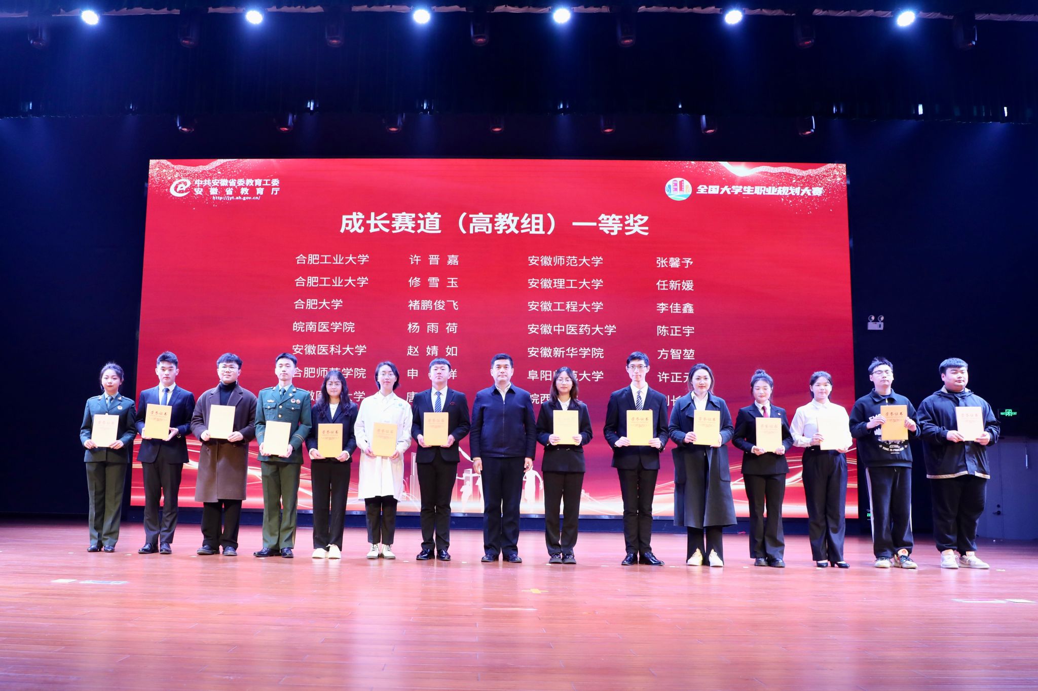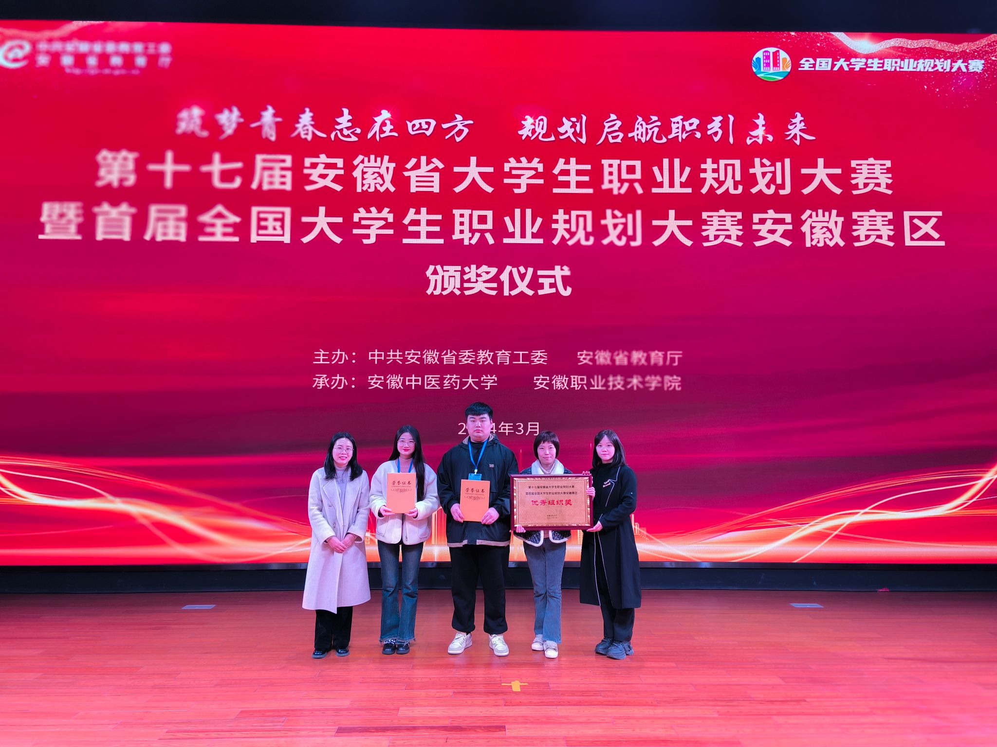 3月12日至14日,由安徽省教育厅主办的第十七届全省大学生职业规划大赛暨首届全国大学生职业规划大赛安徽选拔赛总决赛在安徽中医药大学落下帷幕,来自全省88所高校218名大学生参加总决赛。经过激烈角逐,我院电子信息与集成电路学院申祥同学和文学院安晓晓同学分别荣获成长赛道和就业赛道一等奖,我院荣获大赛优秀组织奖。这是我院自第十三届大赛以来连续五届荣获安徽省职业规划大赛一等奖和优秀组织奖。