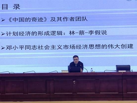 周端明围绕林毅夫、蔡昉、李周所著《中国的奇迹:发展战略与经济改革》,从作者团队、计划经济的形成逻辑、邓小平同志社会主义市场经济思想的伟大创建等三个方面,介绍了该书的写作背景及主要内容,探讨了中国经济快速发展奇迹背后的必然逻辑。他勉励广大青年学生要志存高远,勤于读书,善于读书,怀抱梦想又脚踏实地,敢想敢为又善作善成,争做堪当民族复兴大任的时代新人。