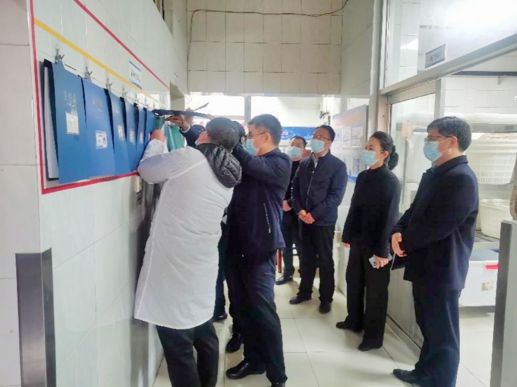 3月28日上午,合肥市委常委、副市长袁飞一行到beat365官网锦绣校区督导检查食品安全工作,院党委委员、副院长华银峰陪同检查。合肥市市场监督管理局和合肥市经开区有关负责人、我院后勤处负责人及相关科室人员参加检查。