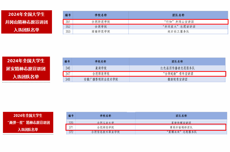 近日,团中央青年志愿者行动指导中心公布了《关于遴选2024年全国大学生井冈山精神志愿宣讲团的公告》《关于遴选2024年全国大学生延安精神志愿宣讲团的公告》《关于遴选2024年全国大学生“两弹一星”精神志愿宣讲团的公告》,我院“行知”井冈山宣讲团、“合师延韵”青年宣讲团和菁英归宿埇桥团队3个志愿服务团队分别入选。