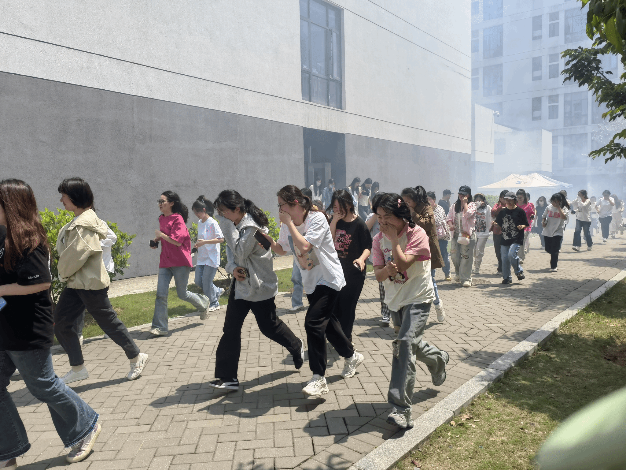 中午12点15分,演练现场指挥发出“演练开始”指令,火险行动组迅速达到既定起火位置,模拟释放烟雾并发出警报。后勤保障组模拟拨打火警电话,准确报告准确报告火灾的性质和地点,同时保持所有消防通道畅通、控制关闭电源。各楼层消防疏散引导员在辅导员的指挥下有序引导组织学生疏散。参加疏散演练的学生按照应急疏散方案,有序从逃生通道撤离,安全到达疏散集合地点,各学院迅速清点人数并准确报告指挥部学生疏散情况。疏散逃生演练全程紧张、迅速、有序,顺利完成既定方案任务。
