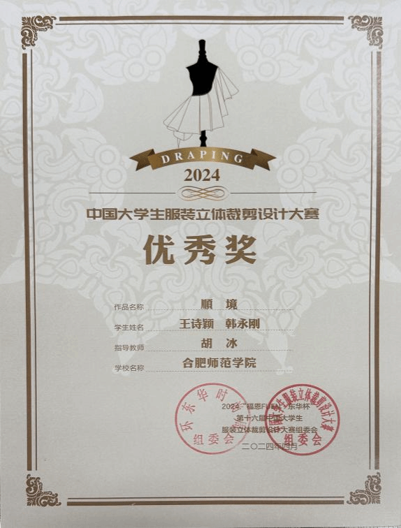 学院学子在2024“福恩 FUEN·东华杯”第十六届中国大学生服装立体裁剪设计大赛中斩获金奖