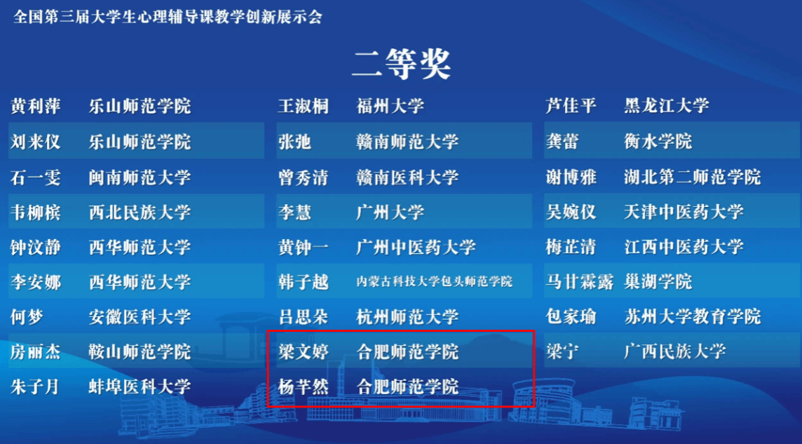 4月25日至26日,由教育部高等学校心理学类专业教学指导委员会、中国心理学会主办,浙江师范大学、华东师范大学、桐乡市教育局承办的全国第三届大学生心理辅导课教学创新展示会在浙江桐乡举行,教育与心理科学学院2021级本科生梁文婷、2022级本科生杨芊然凭借出色的表现双双斩获全国二等奖。