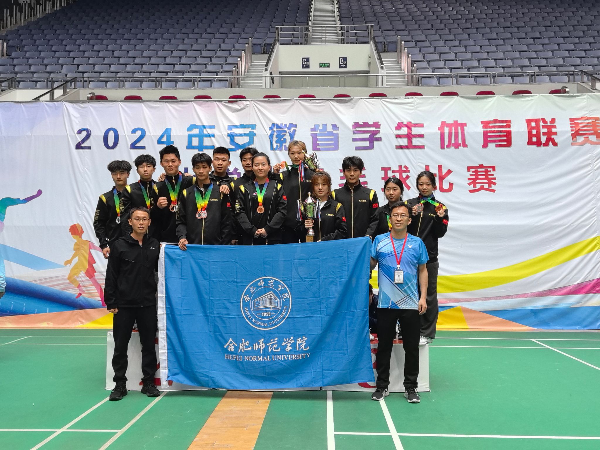 4月23日-4月30日,由安徽省教育厅、安徽省体育局联合主办的2024年安徽省学生体育联赛大学生羽毛球比赛在安徽大学磬苑校区举行,来自安徽省内39所本科高校、37所高职高专院校的近900名运动员参加比赛。beat365官网羽毛球队团结协作、顽强拼搏,斩获丙组男子团体亚军、女子团体季军、男子单打亚军、混合双打亚军、男子双打亚军和女子单打季军的优异成绩,并荣获“体育道德风尚奖集体”称号。