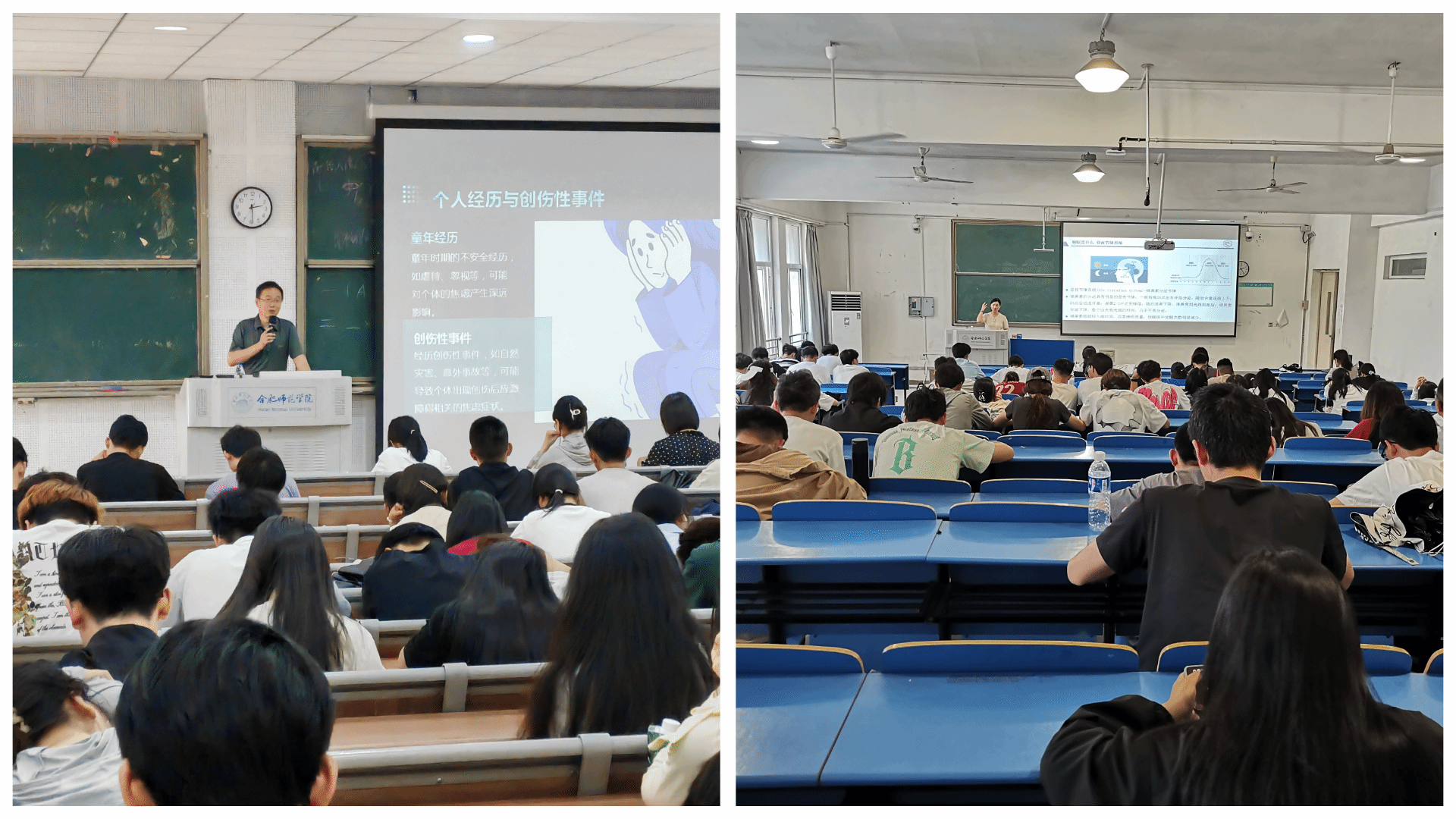 本次活动开展专题心理讲座2场,近500人参与了专题心理讲座。安徽医科大学附属巢湖医院精神科主任医师盛承东开展《今天你善待自己了么—拒绝内耗,远离焦虑》心理科普讲座,从内耗与焦虑的概念及危害、对生活影响分析、如何调整内耗与焦虑三点入手,深入浅出的介绍了当前大学生焦虑现状,并结合大量具体案例分析了日常生活中产生焦虑内耗的成因,重点讲解了三大方面十八项措施帮助同学们缓解焦虑水平,减轻内耗。安徽省精神卫生中心(合肥第四人民医院)睡眠障碍科副主任医师张玉给学生带来了《今天你睡好了吗?—睡眠障碍及其调适》心理科普讲座,从与同学们共同探讨了睡眠的基础知识,同时对睡眠与心理健康的关系进行了深入的解析,并对学生较为关注的“失眠了怎么办”问题提出认知行为治疗、放松训练疗法和光照治疗三种应对方式,并通过现场体验的方式详细介绍了三种应对方式的操作过程,帮助学生解决失眠困扰。