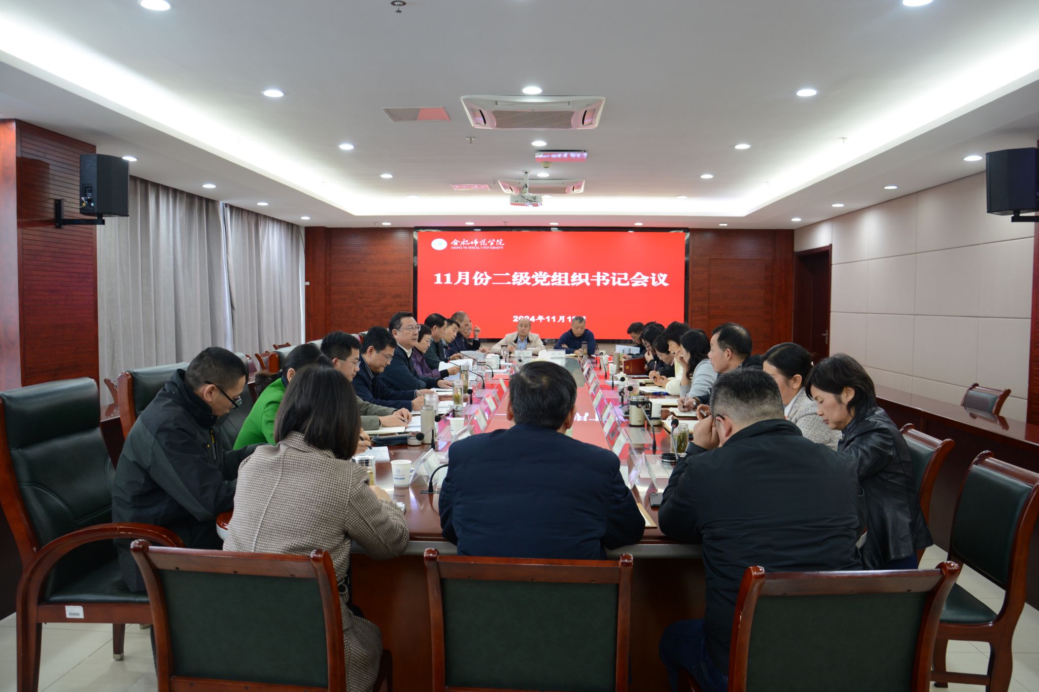 按照学院“月调度、季晾晒、年考核”党建工作推进机制,11月19日上午,学院在锦绣校区行知楼第二会议室召开11月份二级党组织书记例会,调度推进季度党建重点工作。院党委书记徐成钢出席会议并讲话,各二级党组织书记,组织部、党政办、纪委办、巡察办、宣传部、统战部、党委教师工作部、党委研究生工作部等部门负责人参加会议,会议由党委副书记梁立昌主持。