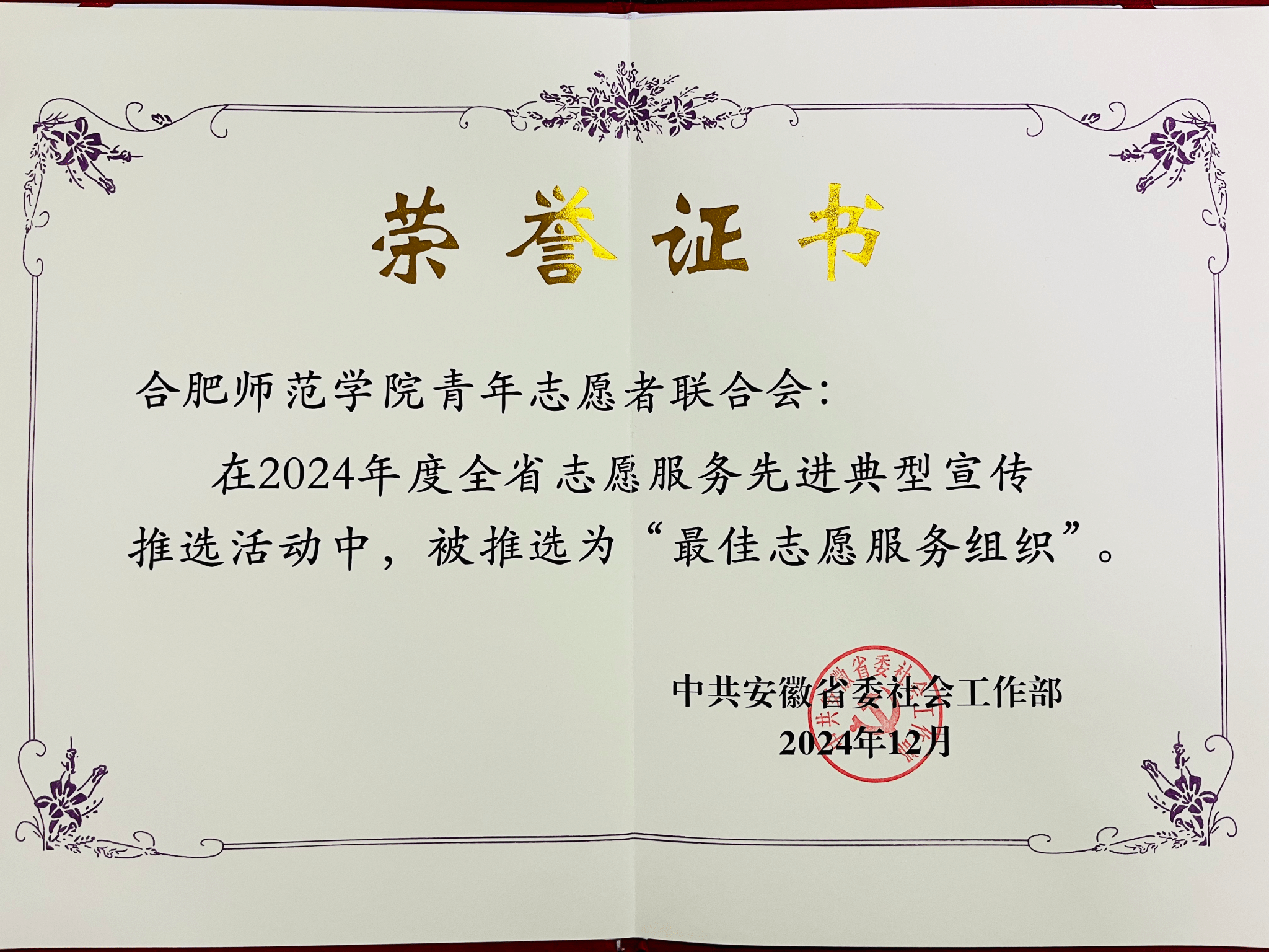 近日,省委社会工作部会同省委宣传部、省民政厅、省总工会、团省委、省妇联和合肥市委联合举办的安徽省暨合肥市2024年国际志愿者日志愿服务交流展示活动在合肥市蜀山区举行。活动现场,发布了安徽省2024年度志愿服务先进典型。我院青年志愿者联合会荣获安徽省2024年度最佳志愿服务组织,本次共有15个组织获奖,全省教育系统仅2个。