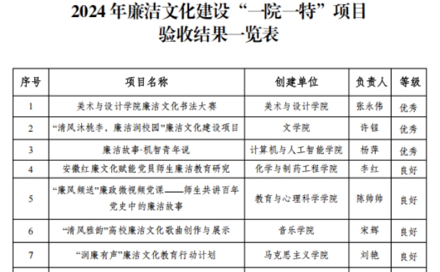 为深入贯彻落实习近平总书记关于加强新时代廉洁文化建设重要论述,推动廉洁文化深度融入高校党的宣传思想文化工作大局,培育具有合师校园文化特色的廉洁文化项目,2024年学院出台《廉洁文化建设“一院一特”项目创建实施方案》,积极推动14个二级学院结合学科专业特点、传统文化优势,深入挖掘廉洁资源,打造融思想性、教育性、艺术性于一体的廉洁文化品牌,护航学院事业高质量发展。