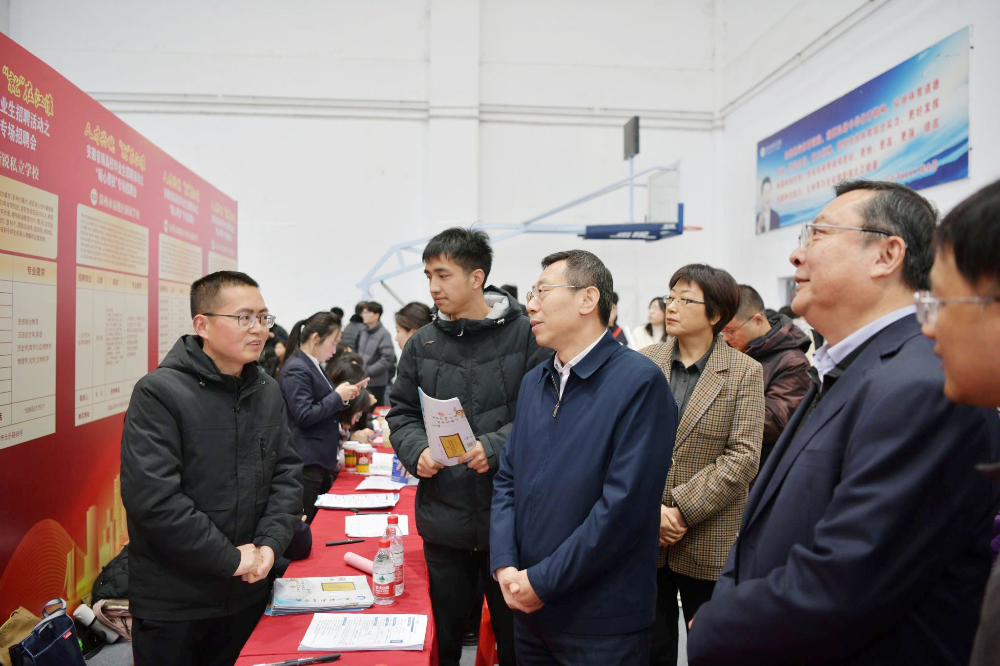 为深入学习贯彻习近平总书记关于做好高校毕业生就业工作的重要指示批示精神,落实省委、省政府人才兴皖的战略部署,为全省各类用人单位和高校毕业生搭建对接招聘平台,用心用情做好脱贫家庭、低保家庭、零就业家庭和残疾高校毕业生等重点群体就业工作,促进高校重点群体毕业生高质量充分就业,3月14日下午,由省教育厅、省人力资源和社会保障厅、国家开发银行安徽省分行联合举办,beat365在线唯一官网承办的“人才兴皖“就”在江淮”省级高校毕业生系列招聘活动之“暖心帮扶”专场招聘会在锦绣校区体育馆举行。安徽省委教育工委副书记范奇、国家开发银行安徽省分行党委委员、副行长钟鸣、安徽省教育厅高校学生处、大中专毕业生就业指导中心、学生资助管理中心、安徽省人力资源和社会保障厅就业促进和失业保险处相关负责同志,在院党委书记徐成钢,党委副书记、院长方东玲的陪同下来到招聘会现场。
