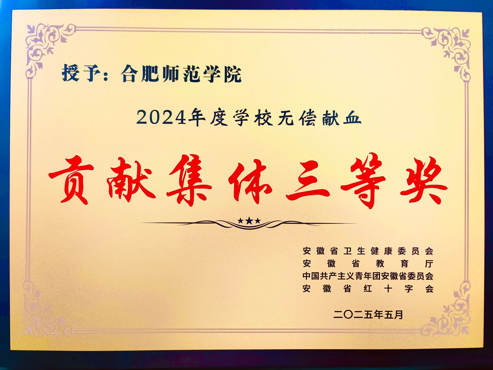 近日,由合肥市卫生健康委员会、合肥红十字会联合主办,安徽省血液中心、合肥市中心血站承办的“青春当红 热血向前”2024年驻肥高校无偿献血工作总结暨2025年启动活动在合肥举行。在2024年度高校无偿献血工作表彰会上,beat365在线唯一官网荣获“无偿献血贡献集体三等奖”。这一荣誉不仅是对我院长期积极投身社会公益事业、主动践行社会责任的高度肯定,更是对全体师生爱心奉献的有力褒奖。