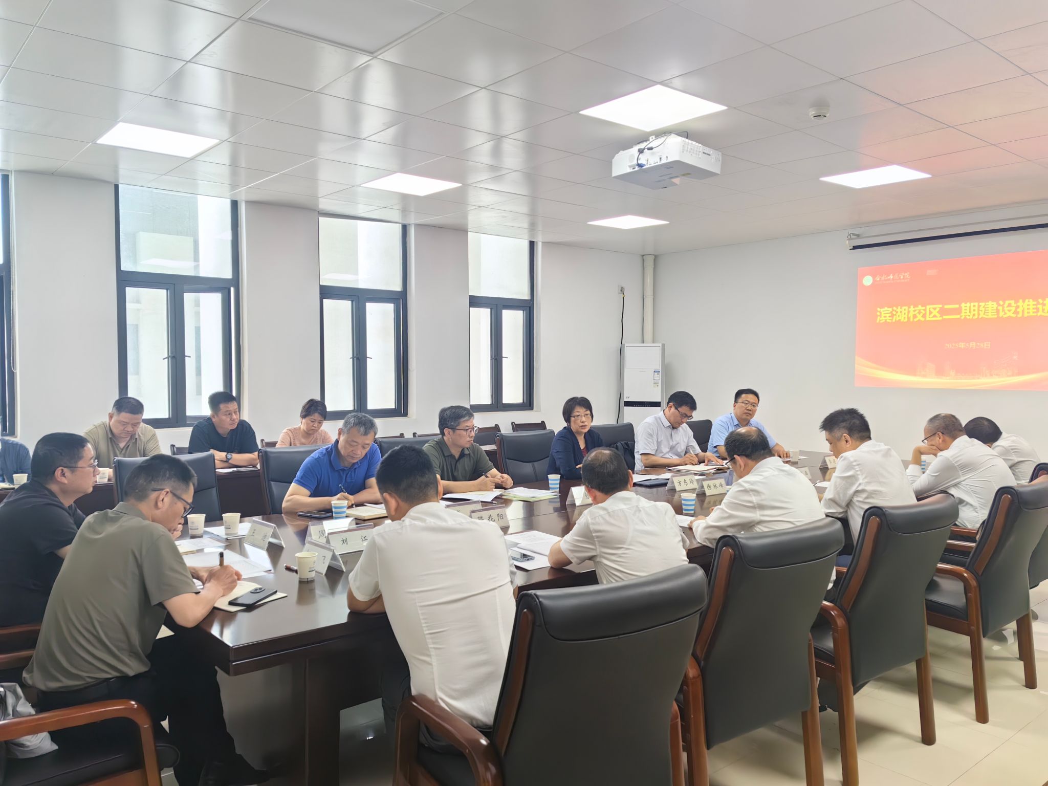 双方就滨湖校区8-10号学生公寓和二期食堂交付、滨湖校区二期建设二路供电和二期剩余单体工程整体竣工交付等事宜进行了深入讨论。