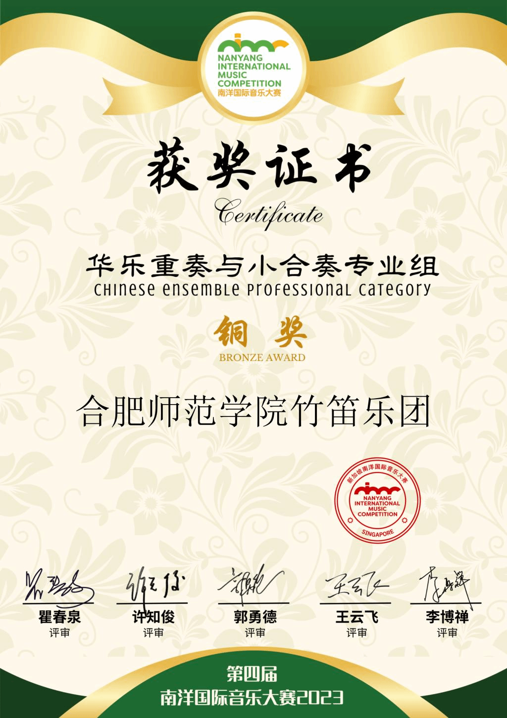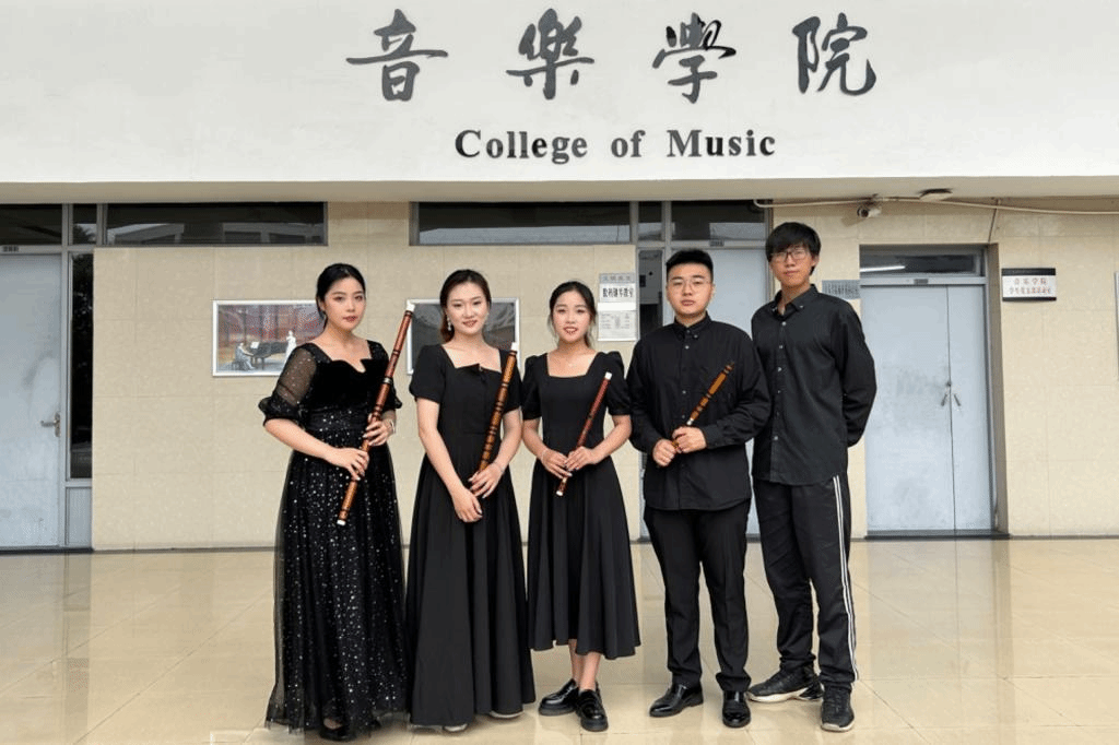 本网讯 由新加坡南洋艺术学院主办的第四届南洋国际音乐大赛(华乐组)于7月25日圆满落幕。音乐学院2020级4位竹笛主项学生郑伟康、高佳佳、赵晓雨、王子妍,2022级打击乐主项学生侯仰骐组成的“beat365在线唯一官网竹笛乐团”在指导老师马雪的指导下参加了华乐重奏与小合奏专业组比赛,斩获铜奖。