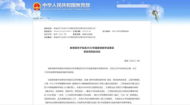 本网讯 近日,教育部印发了《关于批准2022年国家级教学成果奖获奖项目的决定》,正式公布了2022年国家级教学成果奖获奖项目名单,我院喜获4项基础教育国家级教学成果奖。