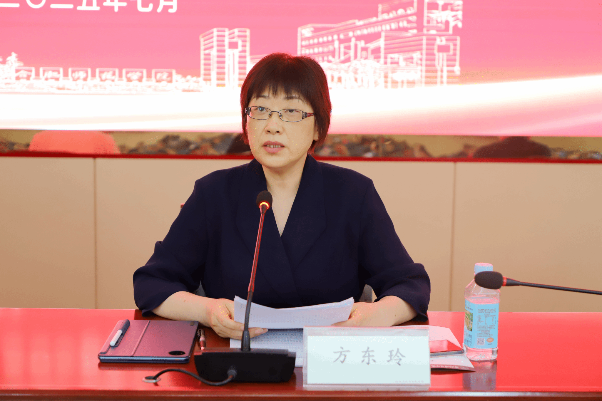 方东玲作《知行合一强应用 追求卓越育新人 奋力谱写本科教育高质量发展新篇章》主题报告。她全面总结了自2020年学院召开本科教育工作会议以来,在统筹推进申硕、“双特”建设、教育教学审核评估、专业结构调整、师资培养考核、教育教学改革、教学资源保障等七个方面取得的重要进展和成果,深刻分析了当前学院在教育教学理念、人才培养模式、专业建设改革、课程改革、实践教学水平、教师教育教学能力等六个方面存在的关键问题。提出了今后三年学院本科教育高质量发展的行动纲领和目标,即重点实施“1722”行动计划,至2028年7月,要基本建成教育理念先进、专业结构优化、产教融合深入、数智赋能有力、满足学生发展的高质量本科教育教学体系,擦亮师范教育底色,彰显产教融合特色,学院教育教学综合实力稳居全省应用型本科院校第一方阵。