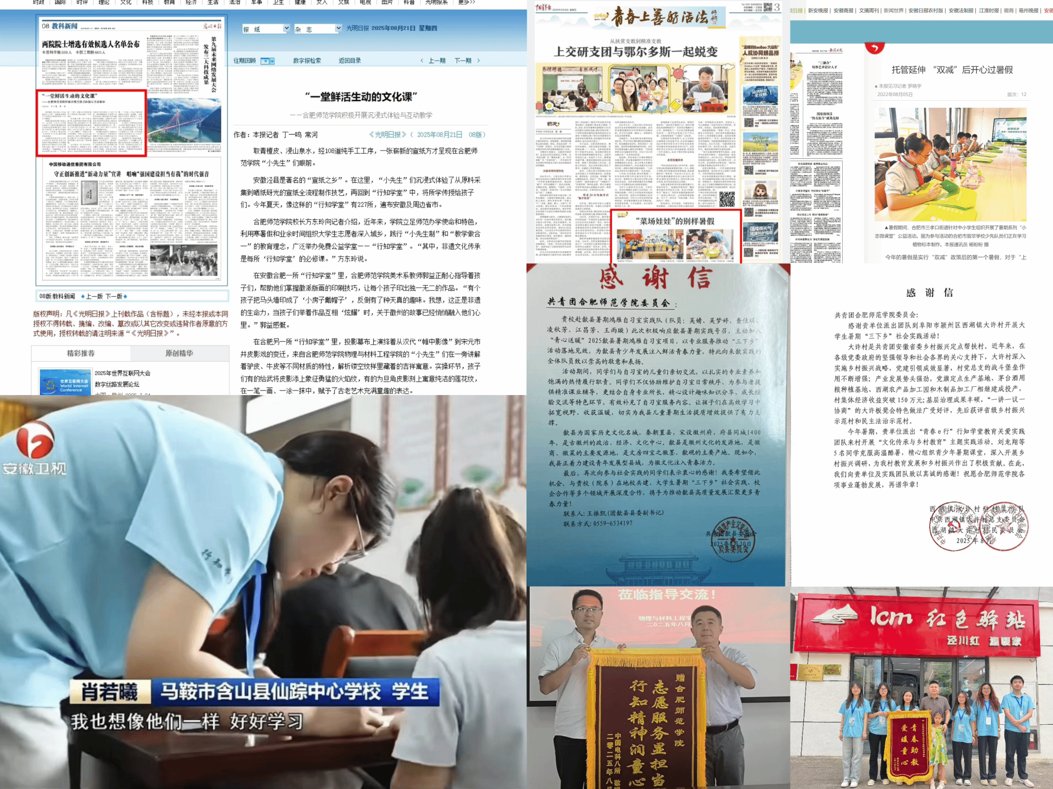今年暑期,随着“行知学堂”实践活动知名度和影响力进一步扩大,吸引了合肥工业大学、河南大学、安徽师范大学等39名外校青年大学生主动参与建设学堂20个,服务农村留守儿童1000余人。《光明日报》围绕非遗文化传承进行专题报道,《中国青年报》《中国教育报》《工人日报》、人民网、中国教育新闻网、学习强国、高校思政网等多家国家级主流媒体,安徽新闻联播、《安徽日报》《安徽青年报》等省级多家主流媒体累计报道1000余次。学校先后收到中国电科八所,合肥市包河区望湖街道卫塘社区、包河区义城街道迎淮社区、瑶海区长淮街道火车站社区,含山团县委,歙县团县委,黄山风景区团区委,宿州市埇桥区东关街道大泽社区,六安市金安区望城街道正阳社区,阜阳市颍州区西湖镇大许村等地方基层政府、学员家长赠送数面锦旗和多封感谢信。