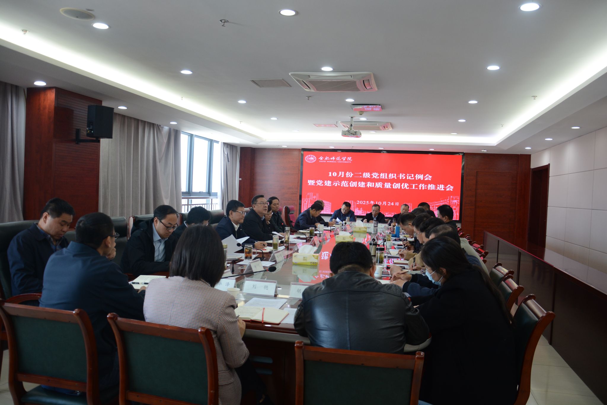 为进一步总结学院新时代党建示范创建和质量创优工作经验,部署推进新一批培育和申报工作,10月24日上午,学院在锦绣校区行知楼第二会议室召开10月份二级党组织书记例会暨党建示范创建和质量创优工作推进会。院党委书记徐成钢出席会议并讲话,各二级党组织书记,组织部、宣传部、党政办、纪委办、巡察办、团委、党委教师工作部、党委研究生工作部、学生工作部、保卫部等部门负责人参加会议,会议由党委副书记梁立昌主持。