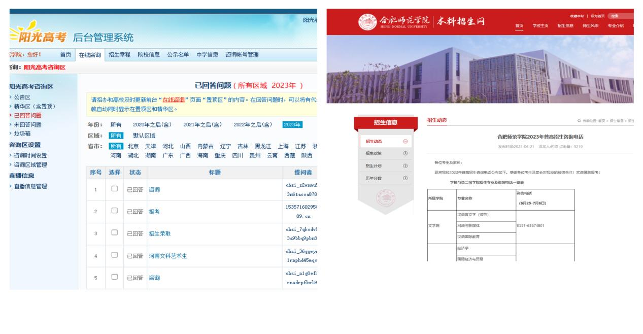 学院积极联系中安在线等媒体向广大考生及家长详细解读我院各项招生政策,帮助考生合理填报志愿。积极参与教育部“阳光高考”咨询平台,全方位为广大考生和家长解答招生政策。志愿填报期间,招生办及各二级学院共开通了热线电话17部,安排专人值班,耐心细致地解答考生及家长的各类咨询问题。招生办还通过本科招生网、安徽省教育招生考试院、中安在线高招直通车、市场星报、中国教育在线以及beat365在线唯一官网和合师青年微信公众号等平台第一时间向考生传递招生资讯。