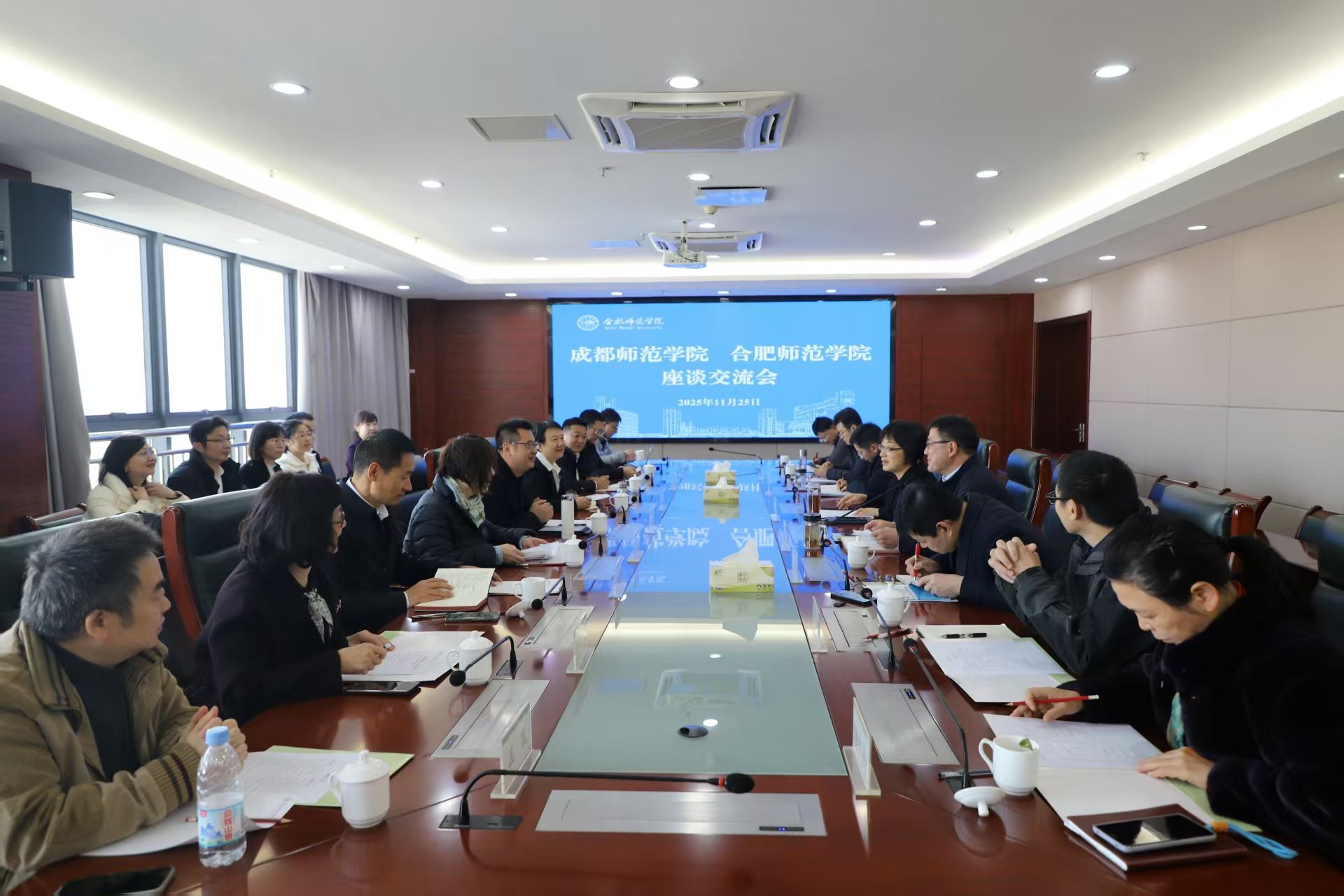 11月25日上午,成都师范学院党委常委、副院长任立刚,党委常委、副院长王姮一行来院调研交流。两校举行座谈会,党委副书记、院长方东玲出席,党委委员、副院长周端明主持。双方围绕“十五五”规划编制、硕士点申报和建设、人才培养和招生就业、应用型转型、教育信息化等进行深入交流。