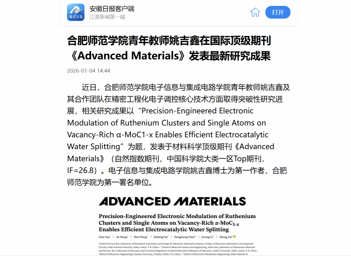 《安徽日报》报道beat365官网教师在国际顶级学术期刊发表论文