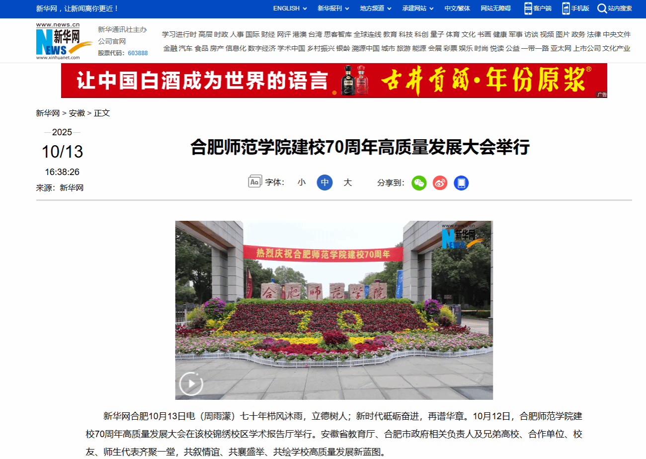 隆重举办建校70周年高质量发展大会,省委教育工委、省教育厅、合肥市政府主要领导及兄弟高校、合作单位领导出席,共绘发展蓝图。新华社、新华网、人民网等省级以上媒体平台纷纷报道学校举办建校70周年高质量发展大会。
