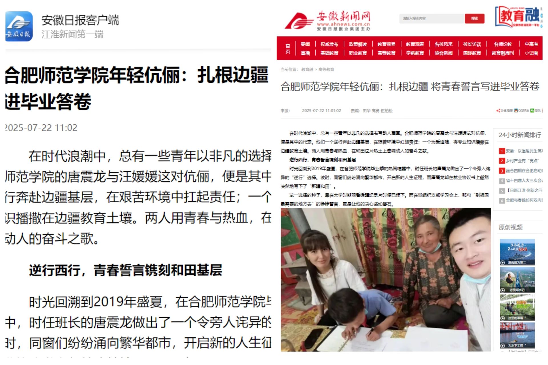 “到祖国最需要的地方去”。在新疆和田,电子信息工程专业校友唐震龙与同窗恋人汪媛媛先后奔赴西部,书写了跨越时空的“合师情缘”。唐震龙扎根基层奉献青春,汪媛媛则登上和田学院讲台播种知识,他们用共同的选择诠释了深沉的家国情怀与合师人的使命担当。