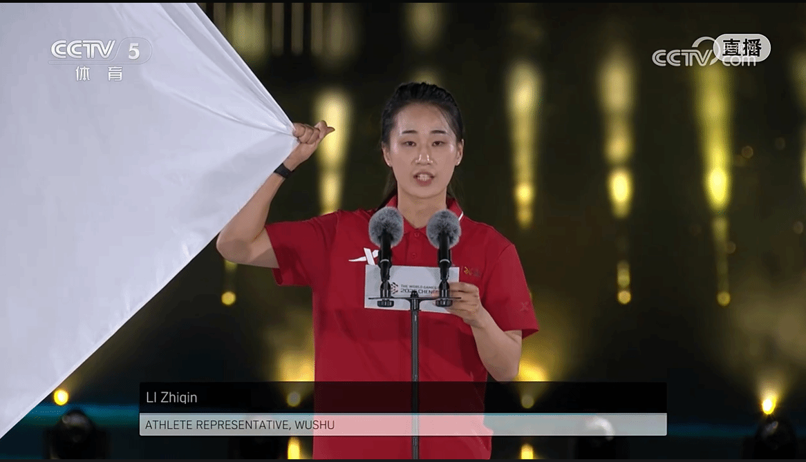 beat365官网教师李志勤作为运动员代表在第12届世界运动会宣誓并夺得武术散打金牌
