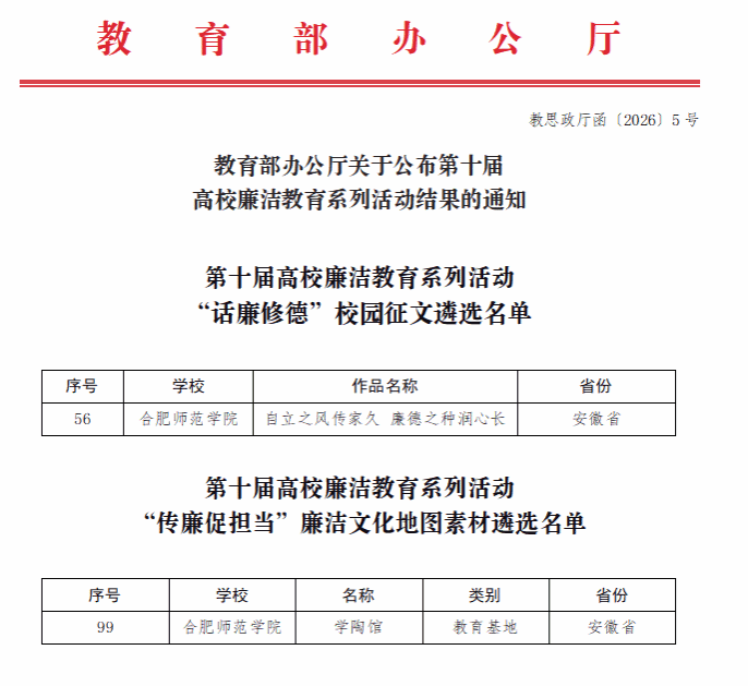近日,教育部公布了第十届高校廉洁教育系列活动结果。经学校申报、省教育厅及教育部专家评审,beat365官网共有2项成果入选,涵盖校园征文、廉洁文化地图素材两个类别,充分展现了学校廉洁文化建设的深厚底蕴与创新活力。