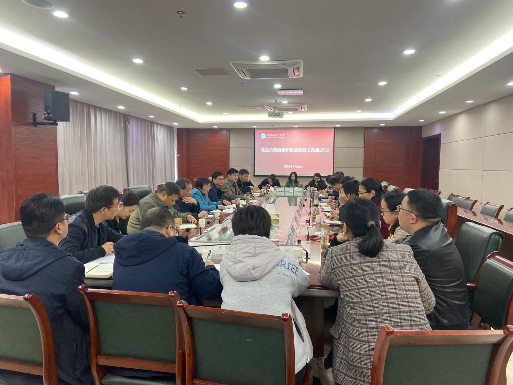 本网讯 3月28日下午,学院在锦绣校区行知楼第二会议室召开党建示范创建和质量创优工作推进会,交流研讨学院党建示范创建和质量创优工作培育创建成果,部署推进下一阶段工作。院党委副书记梁立昌出席会议并讲话,各二级党组织书记,省级“双带头人”教师党支部书记工作室负责人、校级党建研究项目负责人参加会议。会议由院党委委员、组织部部长赵帮恚主持。