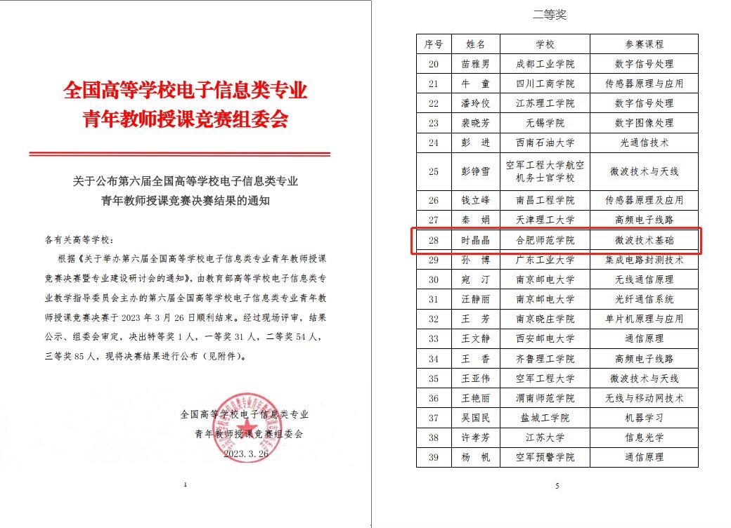 本网讯 3月26日,由教育部高等学校电子信息类专业教学指导委员会主办的第六届全国高等学校电子信息类专业青年教师授课竞赛决赛顺利结束。经过现场评审、结果公示、组委会审定,beat365官网电子信息与集成电路学院时晶晶老师获评全国二等奖,讲授的课程是《微波技术基础》。