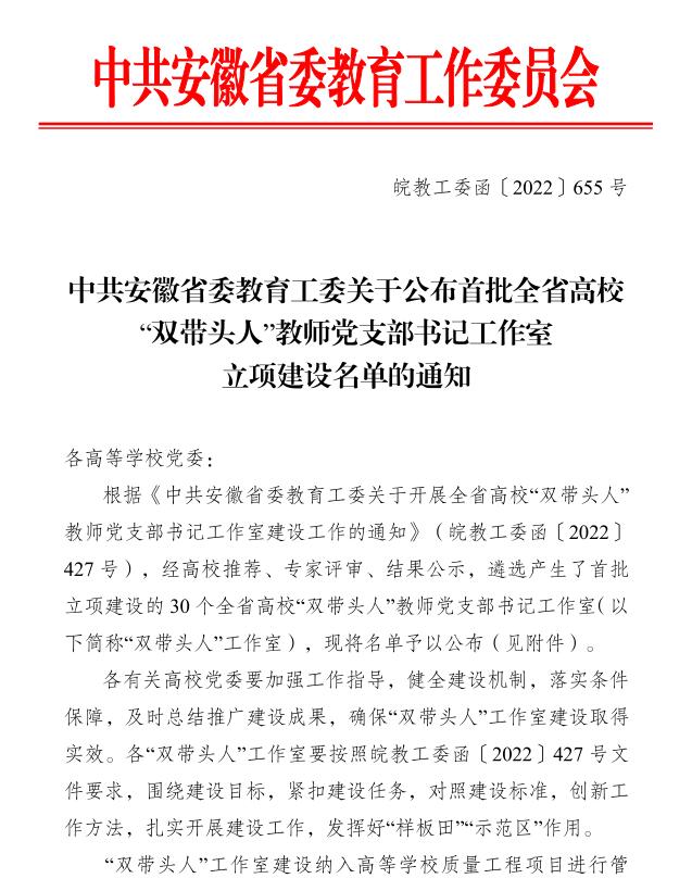 本网讯 近日,中共安徽省委教育工委发布《关于公布首批全省高校“双带头人”教师党支部书记工作室立项建设名单的通知》,首批共遴选建设30个工作室。音乐学院钢琴与声乐系教工党支部康勤工作室获批立项。