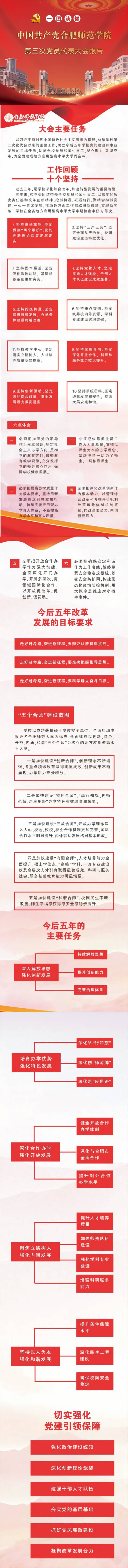 报告全面回顾了学校过去五年所取得的工作成绩,总结了六个方面的发展经验,深入分析了今后五年学校面临的机遇挑战,提出了未来五年发展的指导思想,确立了“以成功获批硕士学位授予单位、全面启动申报更名合肥师范大学为标志,全面建成以创新、特色、开放、内涵、和谐‘五个合师’为核心的地方应用型高水平大学”的奋斗目标。下面,小编带你一图读懂中国共产党beat365在线唯一官网第三次党员代表大会报告。