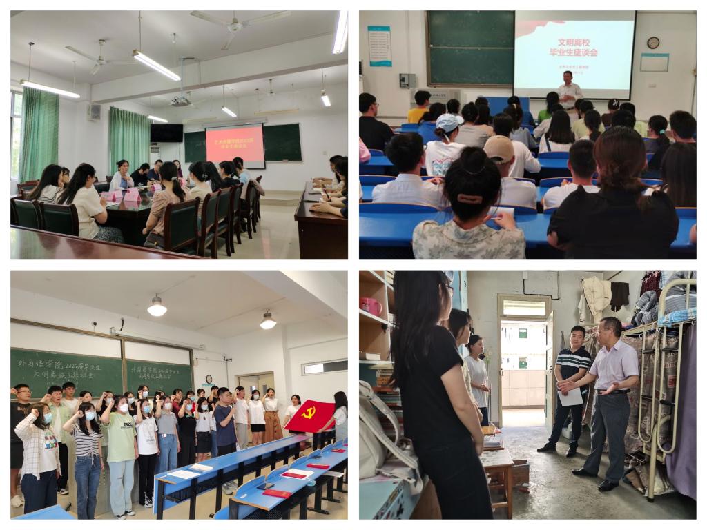 学院开展毕业生文明离校专题教育,着重加强疫情防控、理想信念、法制安全、诚信感恩、就业创业、心理健康、社会责任、文明离校等方面教育,引导毕业生要胸怀理想、锤炼品格,脚踏实地、艰苦奋斗,将个人发展与时代进步相结合,以实际行动为实现第二个百年奋斗目标建功献力;各二级学院通过召开主题班会、座谈会、宿舍走访、毕业生党员主题活动等多种形式加强毕业生安全文明教育,要求毕业生党员和学生干部做好表率,主动参与、积极服务,全力配合学院做好毕业生离校工作,教育全体学生以健康文明的方式离开校园,通过实际行动,表达对母校的依依惜别之情。
