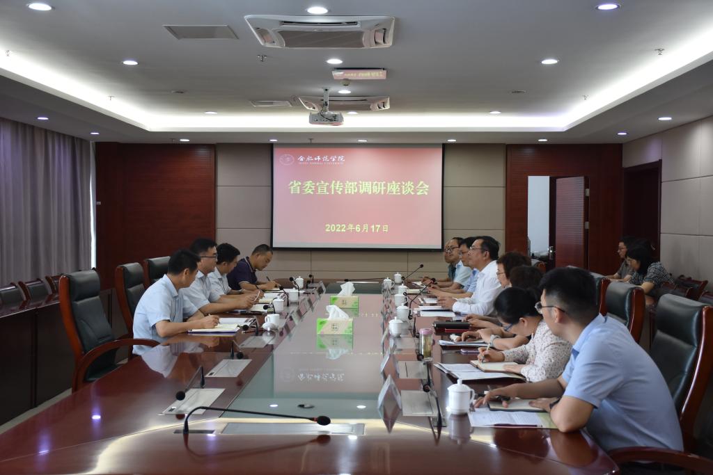 本网讯 6月17日下午,省委宣传部副部长、省政府新闻办主任郑明武,省委宣传部对外联络处处长吴晓辉、新闻发布处处长汪晔宇、思想政治工作处一级主任科员阮玉华等一行四人来院调研意识形态和思想政治工作并召开座谈会。院党委书记徐成钢,党委副书记梁立昌,院办公室、宣传部、学生处、教务处、马克思主义学院负责人、辅导员代表等参加座谈。
