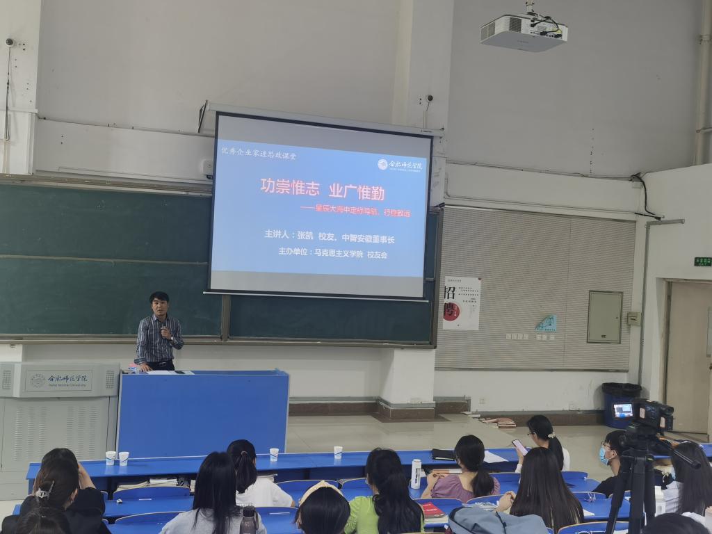 我院2006届优秀校友、中智安徽经济技术合作有限公司执行董事、总经理张凯应邀来校作了题为 “功崇惟志 业广惟勤——星辰大海中定标导航、行稳致远”的报告。他围绕大学生的成长发展,从国家富强、民族复兴、时代发展的需求出发,结合自己的成长历程,提出了大学生首先需要立志定向;其次要勤勉笃实。他希望同学们志存高远,坚定理想信念,强化责任担当,按照习近平总书记提出的要求,做到“立大志,明大德,成大才,担大任”,努力成为堪当民族复兴大任的时代新人;同时又要脚踏实地,吃苦耐劳,在持之以恒、循序渐进、因势而为上下功夫,练就过硬本领,为实现远大抱负蓄势储能。最后,他就大学四年如何度过,从知识学习、能力培养、健康生活、人格涵养、职业选择等方面分享了自己的经验。报告临近结束时,张凯还与同学们进行了互动,解答了大家提出的人生困惑、社会热点等问题。