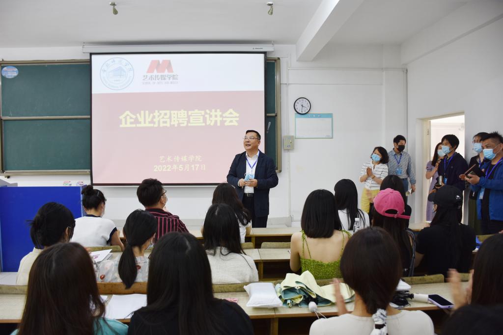 山水空间装饰有限责任公司、冉冉新星教育科技有限公司、秦汉文化艺术发展有限公司、艺唐潮广告传媒有限公司、博仁建筑设计有限公司、竞艺装饰工程有限责任公司等6家用人单位代表也依次介绍了企业情况,并对我院历届校友在综合素质、工作能力、职业态度等方面给予了高度评价。
