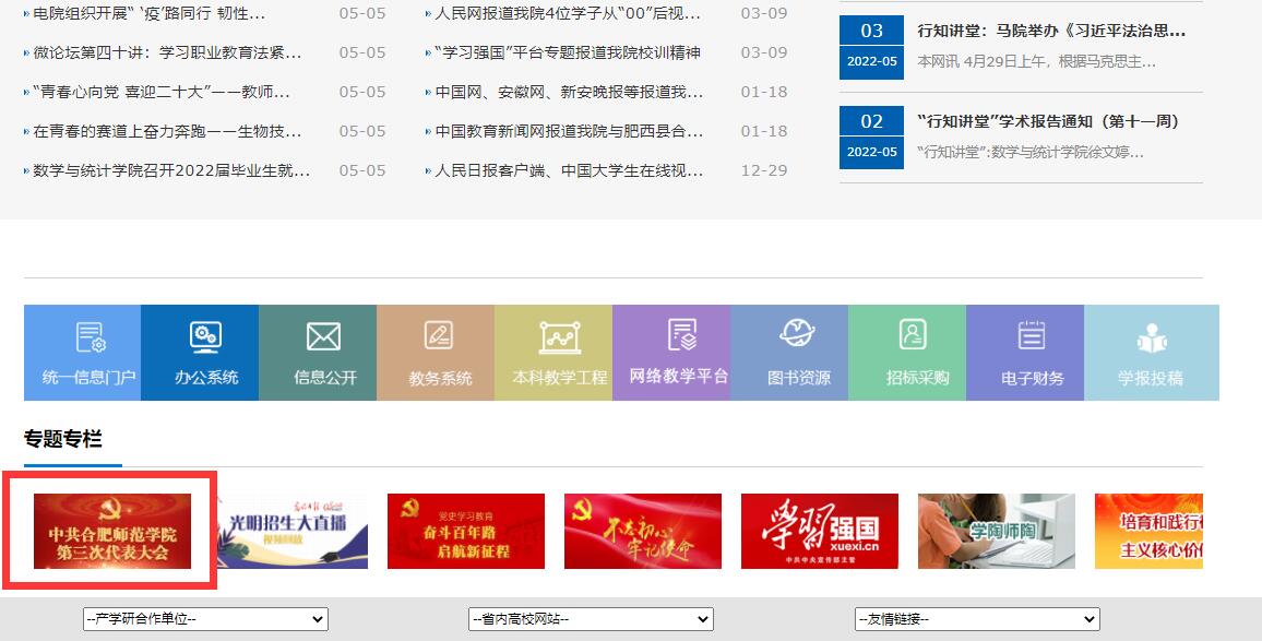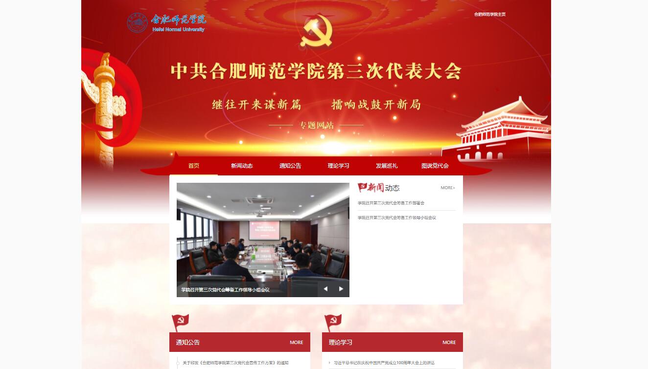 专题网站开设了“新闻动态”“通知公告”“理论学习”“发展巡礼”“图说党代会”五大栏目。“新闻动态”聚焦学校各级党组织加强党的建设,筹备、召开党代会及贯彻落实党代会精神等重要新闻及系列报道;“通知公告”主要发布与党代会相关的通知、文件及报告等内容;“理论学习”宣传、普及党的政策法规及基本常识以及学校第三次党代会有关文件精神;“发展巡礼”回顾总结第二次党代会以来学校各项工作的成绩和经验、展示学校各层面涌现出的先进党员事迹及优秀党组织案例等;“图说党代会”以图文方式报道、展示党代会相关内容。