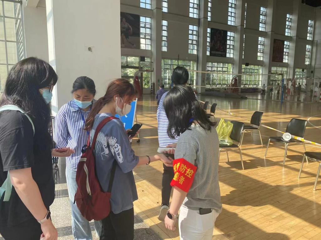 在严峻复杂的疫情防控形势下,各基层党组织进一步充分发挥战斗堡垒作用和广大党员教师的先锋模范作用,汇聚起疫情防控的强大合力。教师党员志愿者们在完成日常教学和工作任务的同时,每日还奔走在各项防疫工作之间。在锦绣校区体育馆,到处涌动着佩戴红袖章志愿者们忙碌的身影。他们在入口处做好体温检测和两码查验,随时指导师生做好核酸检测码登记,来回穿梭在队伍中维护现场秩序……烈日炎炎,志愿者们始终坚守岗位,有效助力核酸检测工作有序高速进行。