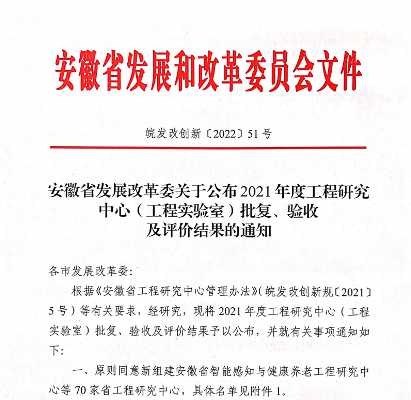 本网讯 日前,安徽省发展和改革委员会下发《安徽省发展改革委关于公布2021年度工程研究中心(工程实验室)批复、验收及评估结果的通知》(皖发改创新〔2022〕51号),同意组建70家省工程研究中心。我院申报的省工程研究中心“安徽省运动健康信息监测技术工程研究中心”获批组建。